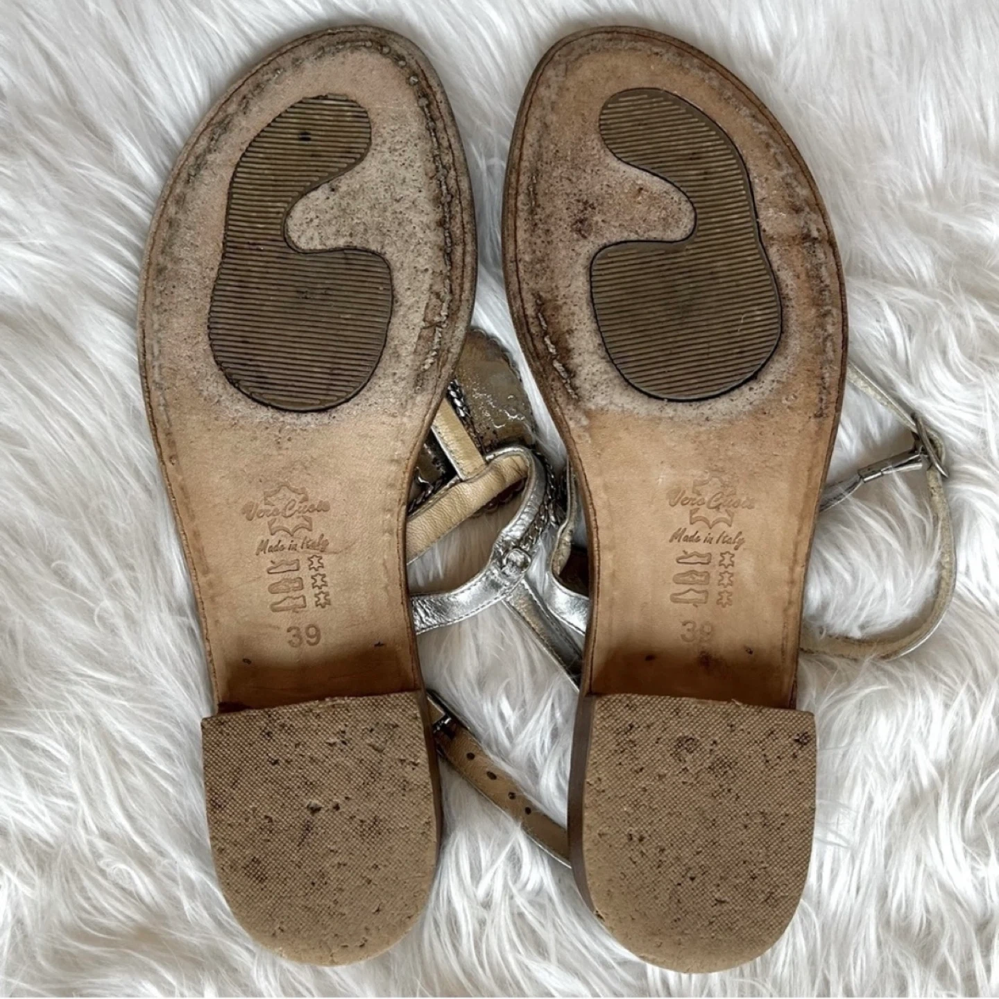 Silver metallic genuine Italian leather embellished sandals from Safari Club Positano in Italy. Silver metallic leather upper with silver chain and large medallion with rhinestones. Genuine leather sole. Worn quite a bit but still in very good condition. Some slight discolouration on the upper sole from water marks and some wear on lower soles (pictured). Women’s size 8.5. (Votives in first photo not included). Cross posted. Winnipeg - Pick up only (Located 2 blocks west of Polo Park). Shipping options available through other platforms message me for details.