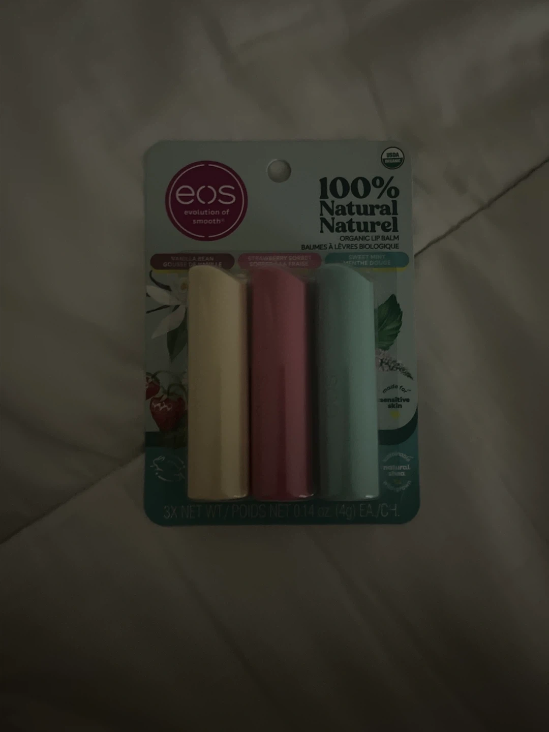 Selling a brand new, unopened 3-pack of EOS 100% Natural lip balms! This pack includes Vanilla Bean, Strawberry Sorbet, and Sweet Mint flavours. Perfect for keeping your lips moisturized and smooth, especially made for sensitive skin!