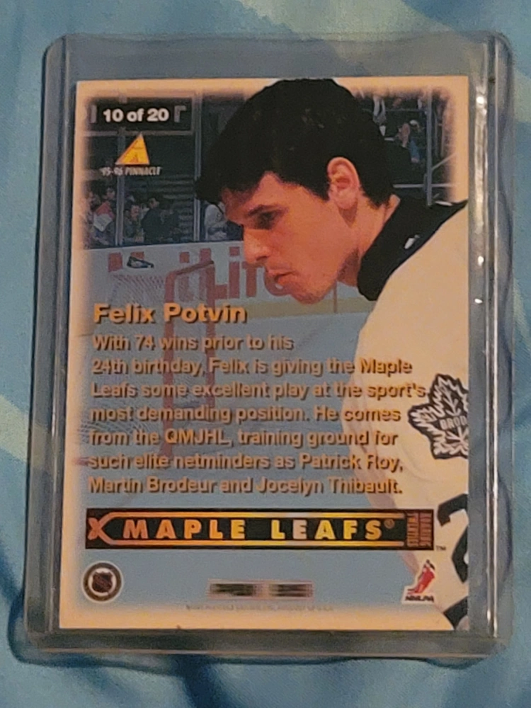 26Selling a Felix Potvin Maple Leafs hockey card. It's in great condition and comes in a protective case. A great addition to any hockey card collection!