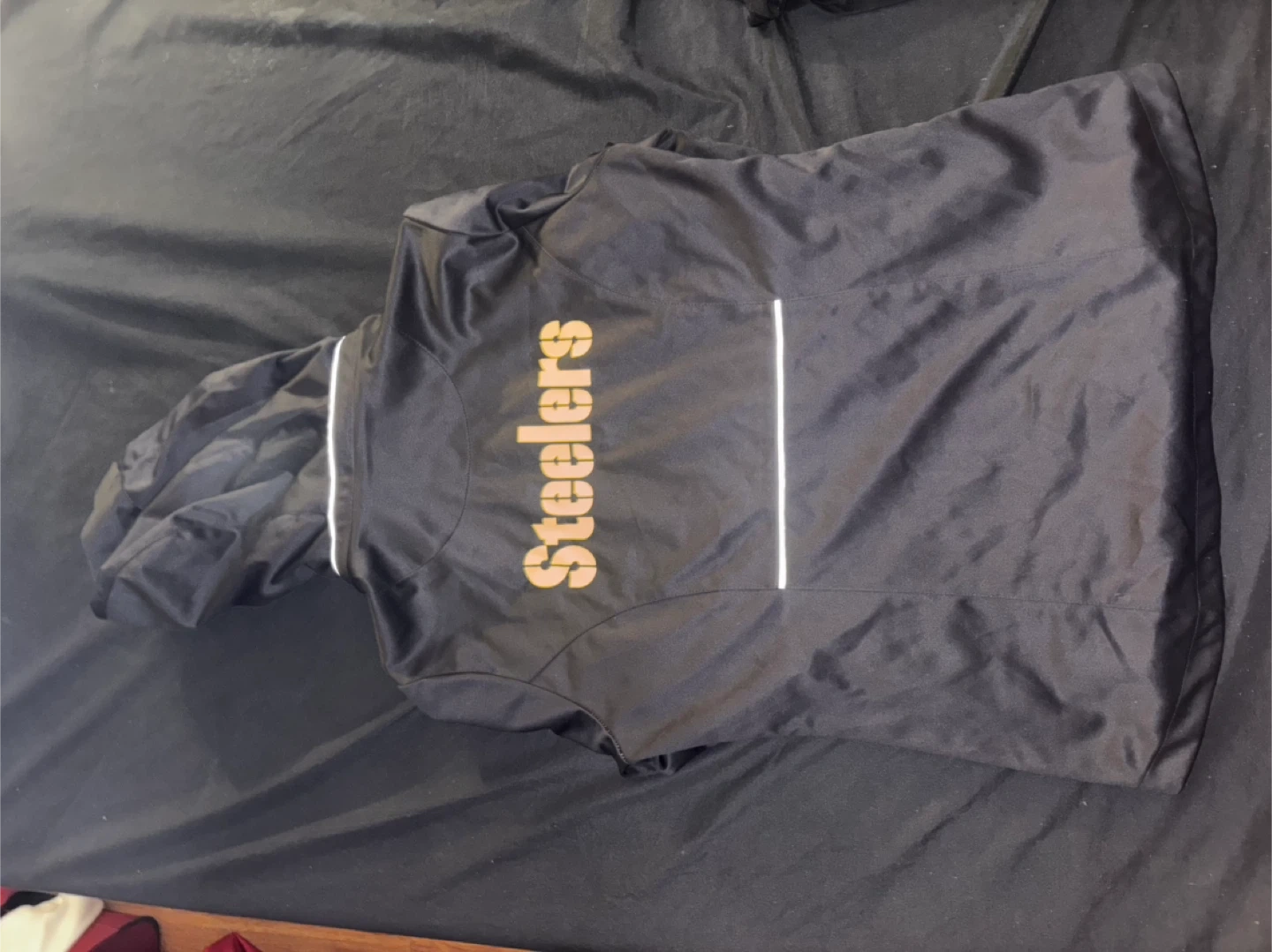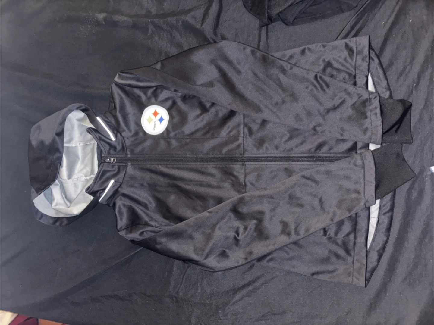 32Selling a black Pittsburgh Steelers jacket. It features the Steelers logo on the front and the team name on the back. Great for showing your team spirit! Size M