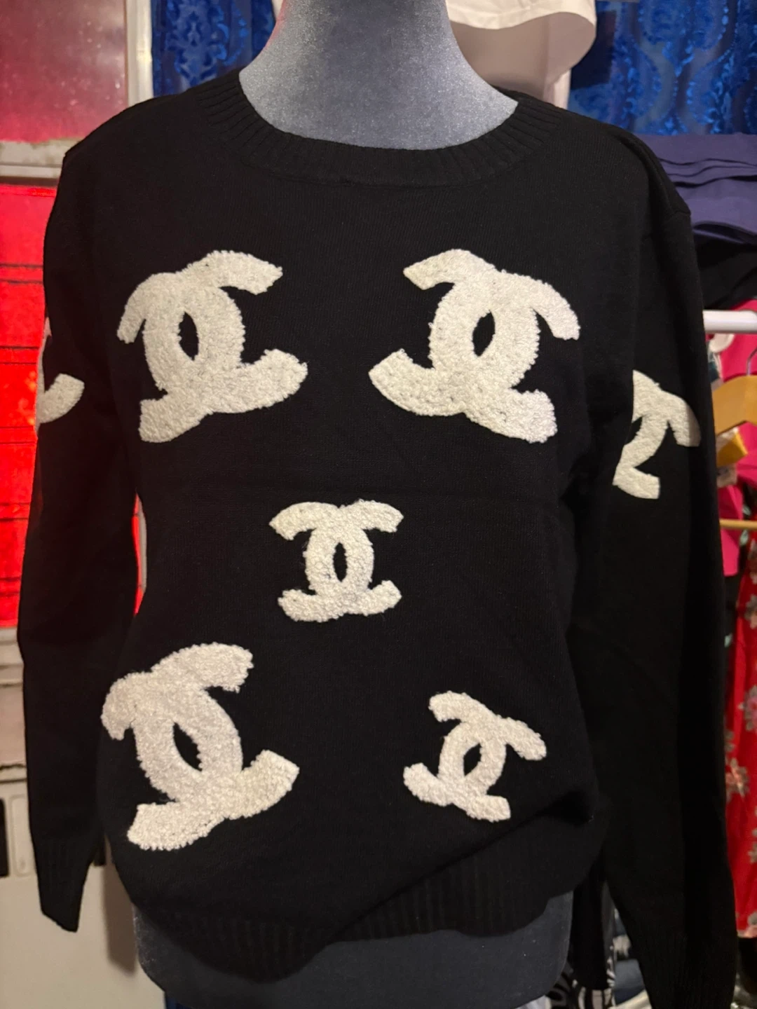 Selling a black sweater with the Chanel logo. It is in good condition and has a unique design