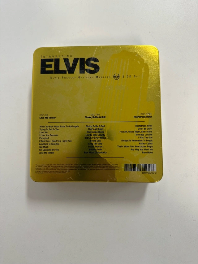 19I'm selling this Introducing Elvis 3 CD set in its original tin case. This set features Elvis Presley's official masters and original recordings. The tin shows signs of wear, including some scratches and marks, but the CDs are in good condition and play perfectly. This collection is a must-have for any Elvis fan! If the ad is live, it's available and ready to find a new home.