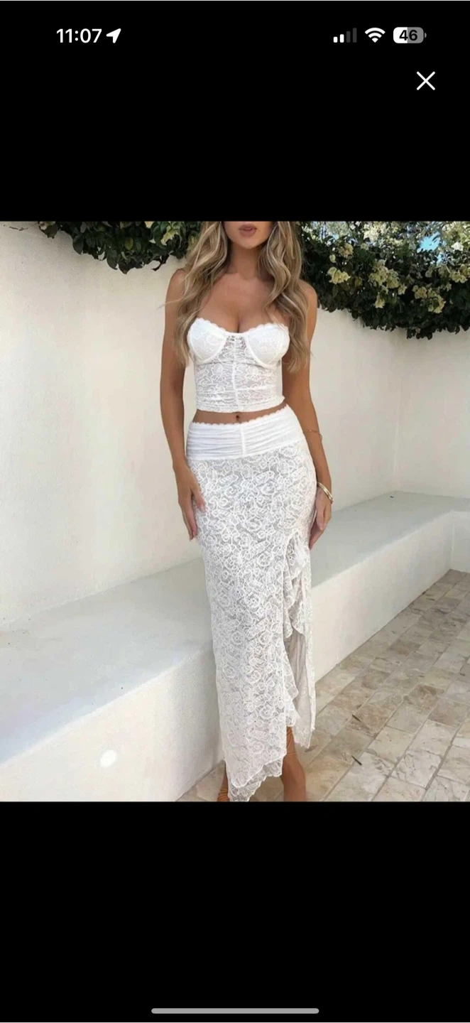 Selling a beautiful white lace two-piece set. It's perfect for a special occasion or a night out. The set includes a lace top and a matching skirt with a slit. The material is delicate and elegant, making it a standout piece in your wardrobe