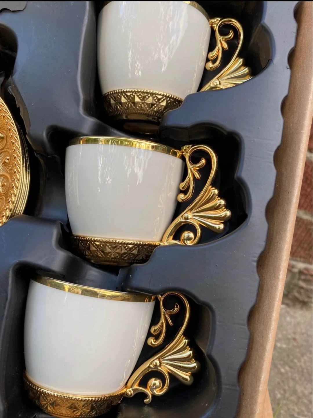 23Selling a beautiful Busam Sanam serving set! This set includes six cups and one saucer, perfect for serving tea or coffee to guests. The cups and saucer feature an elegant design with gold accents. Comes in the original box, making it a great gift idea as well