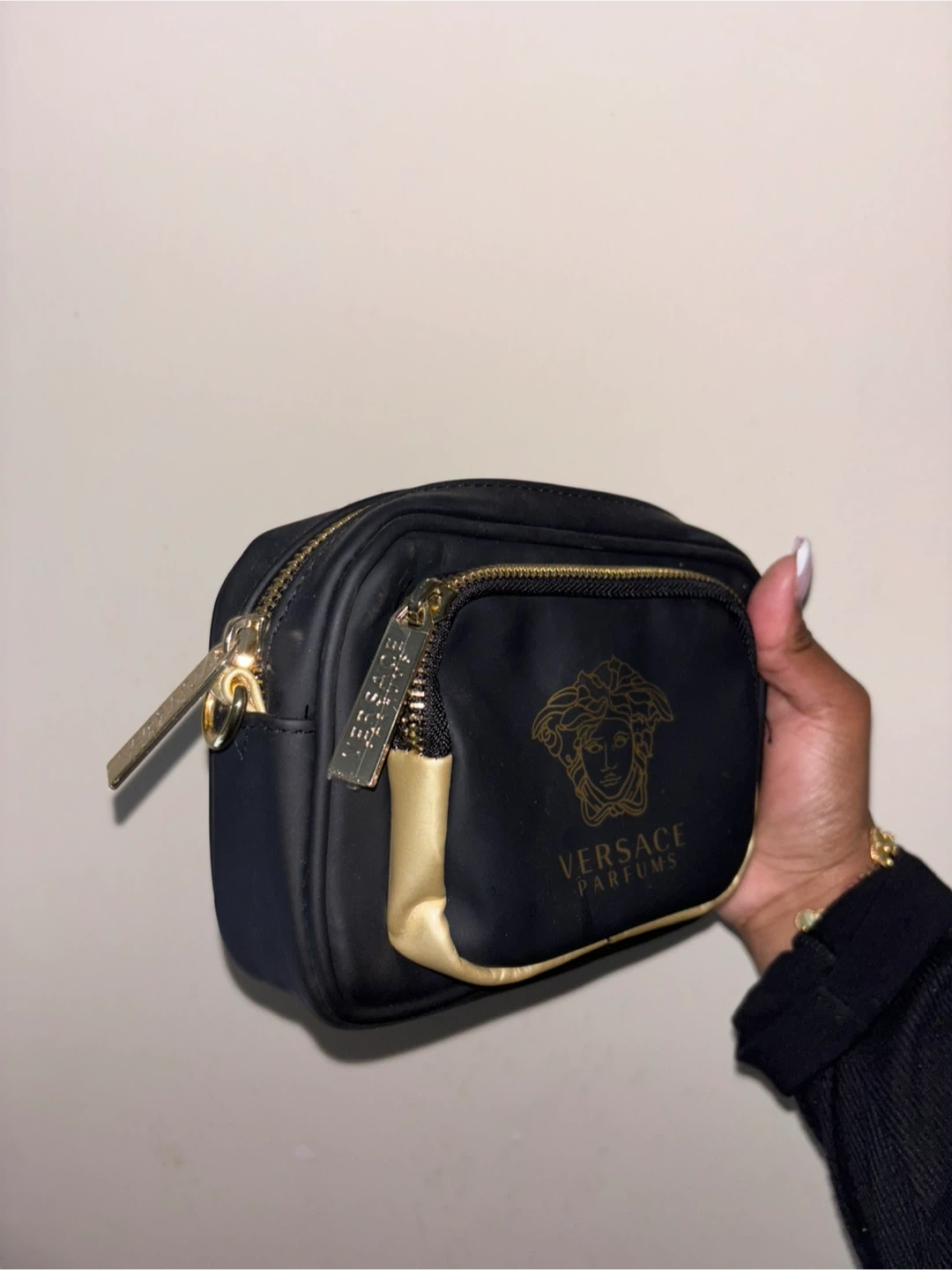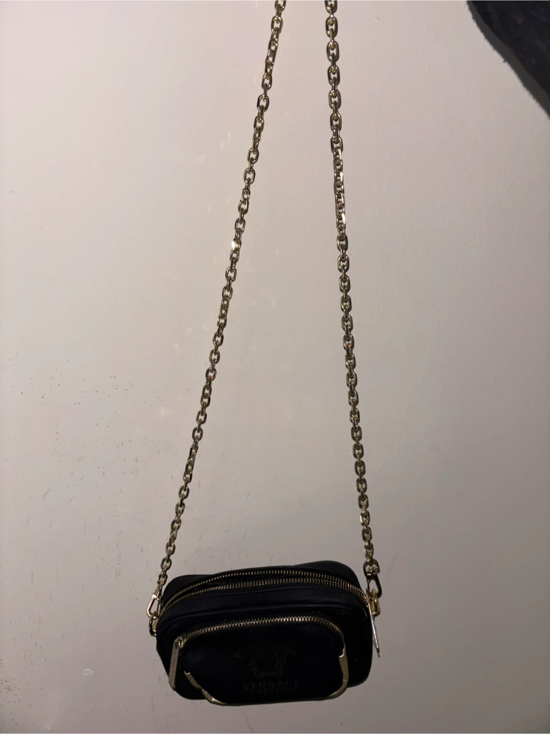 Selling a Versace Parfums crossbody bag in black with gold accents! It's a stylish little bag with a chain strap. Perfect for carrying small essentials.