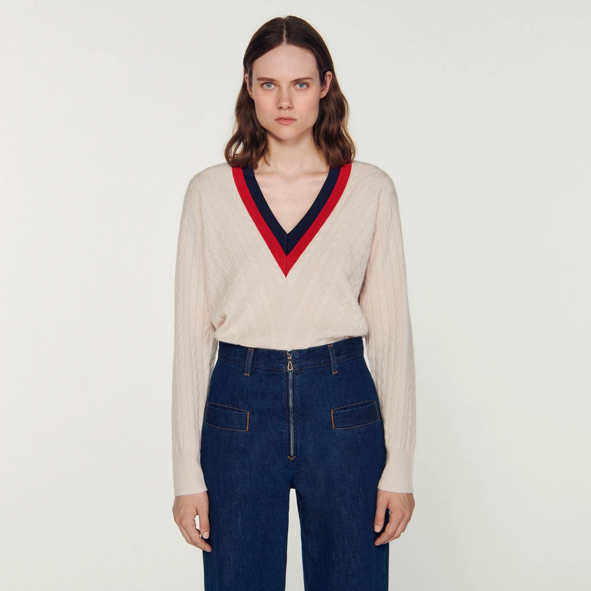 Sandro Paris cable-knit V-neck sweater featuring bold red and navy contrast stripes. Purchased in NYC a few years ago and worn a handful of times.