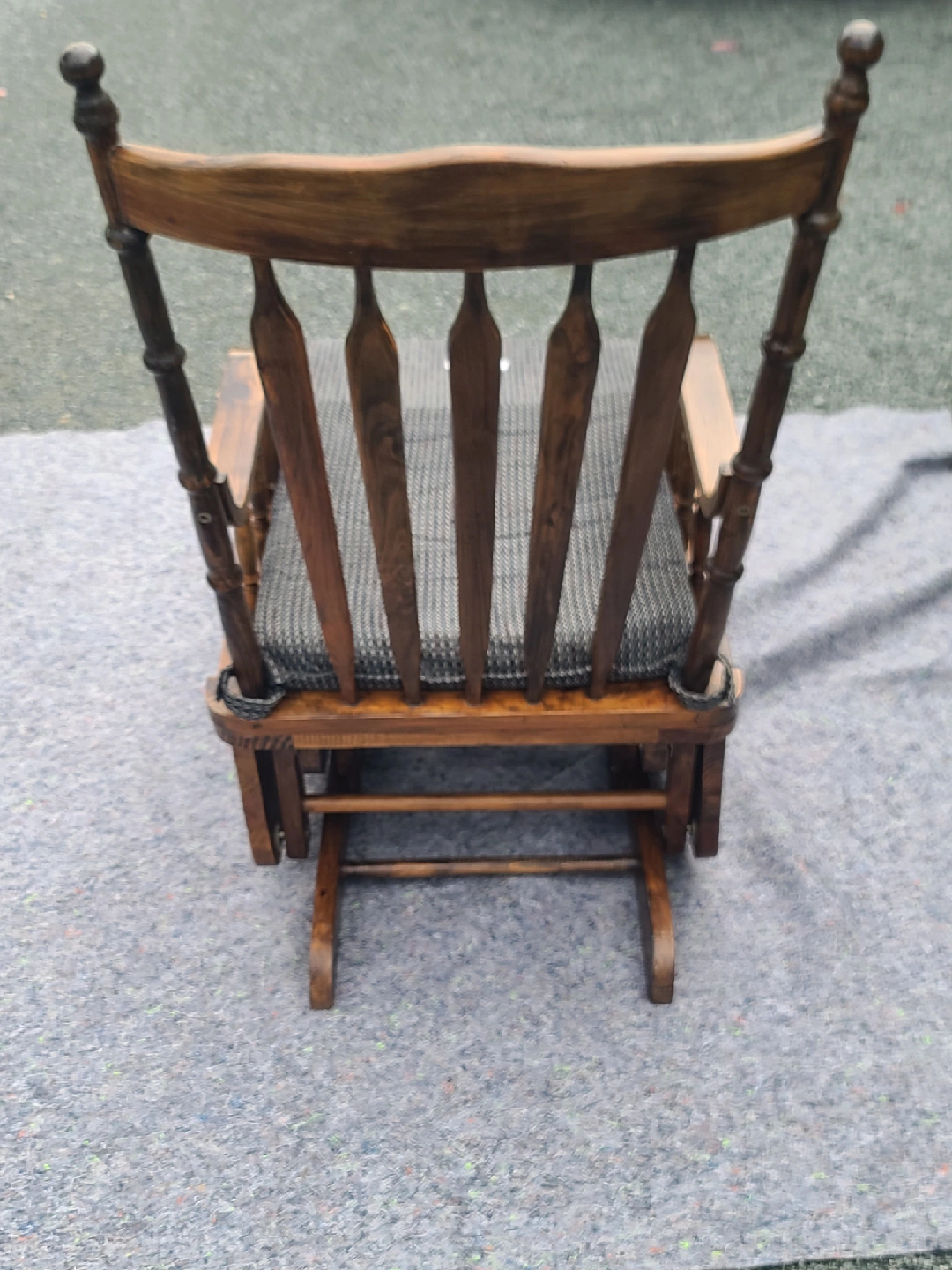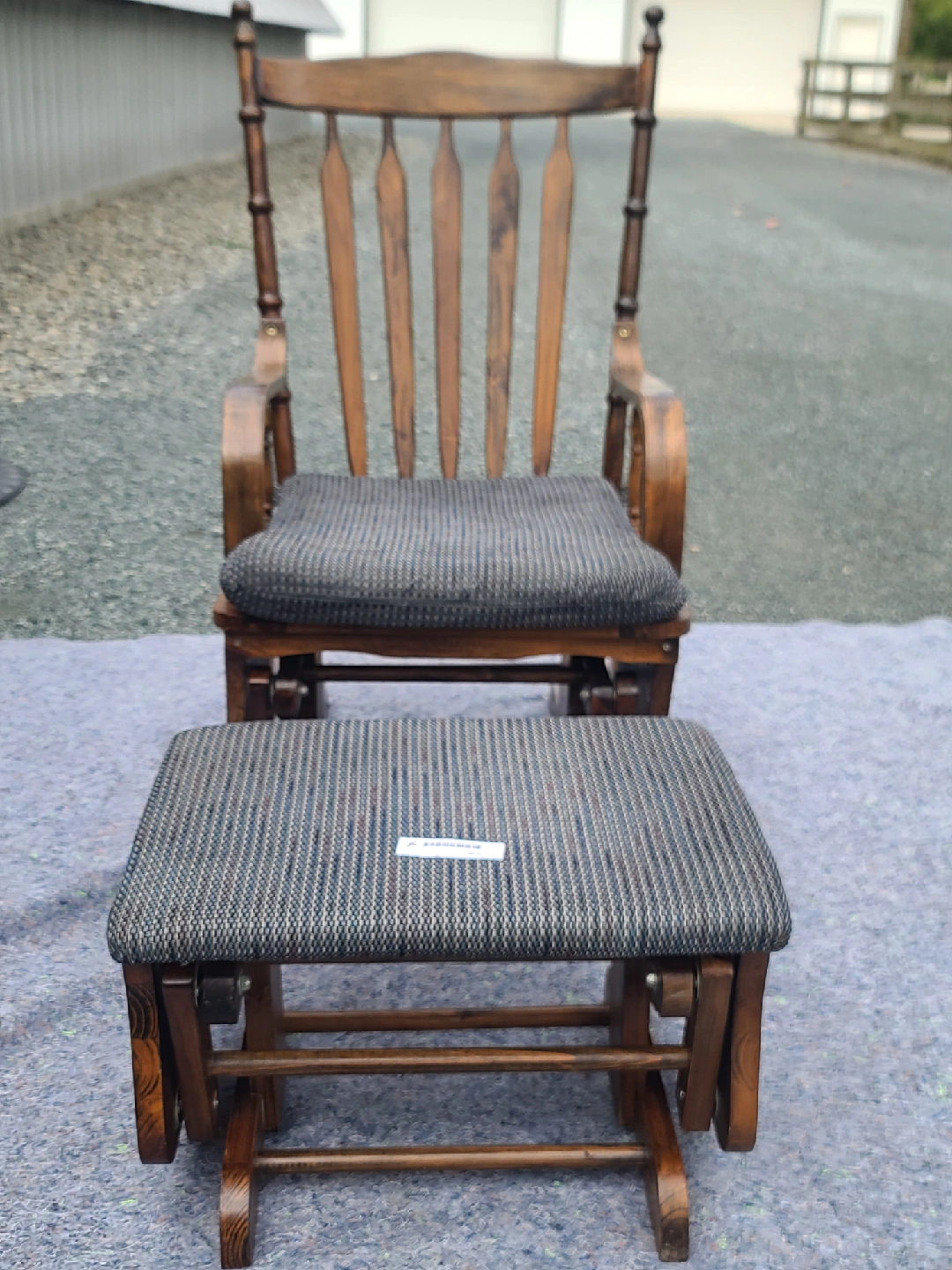 A comfy glider rocking chair with a matching ottoman! It's perfect for relaxing and unwinding after a long day. The chair and ottoman both have a cozy cushion. It would be great for a nursery or living room. Measurements to follow. Delivery can be arranged. viewing and pickup by appointment