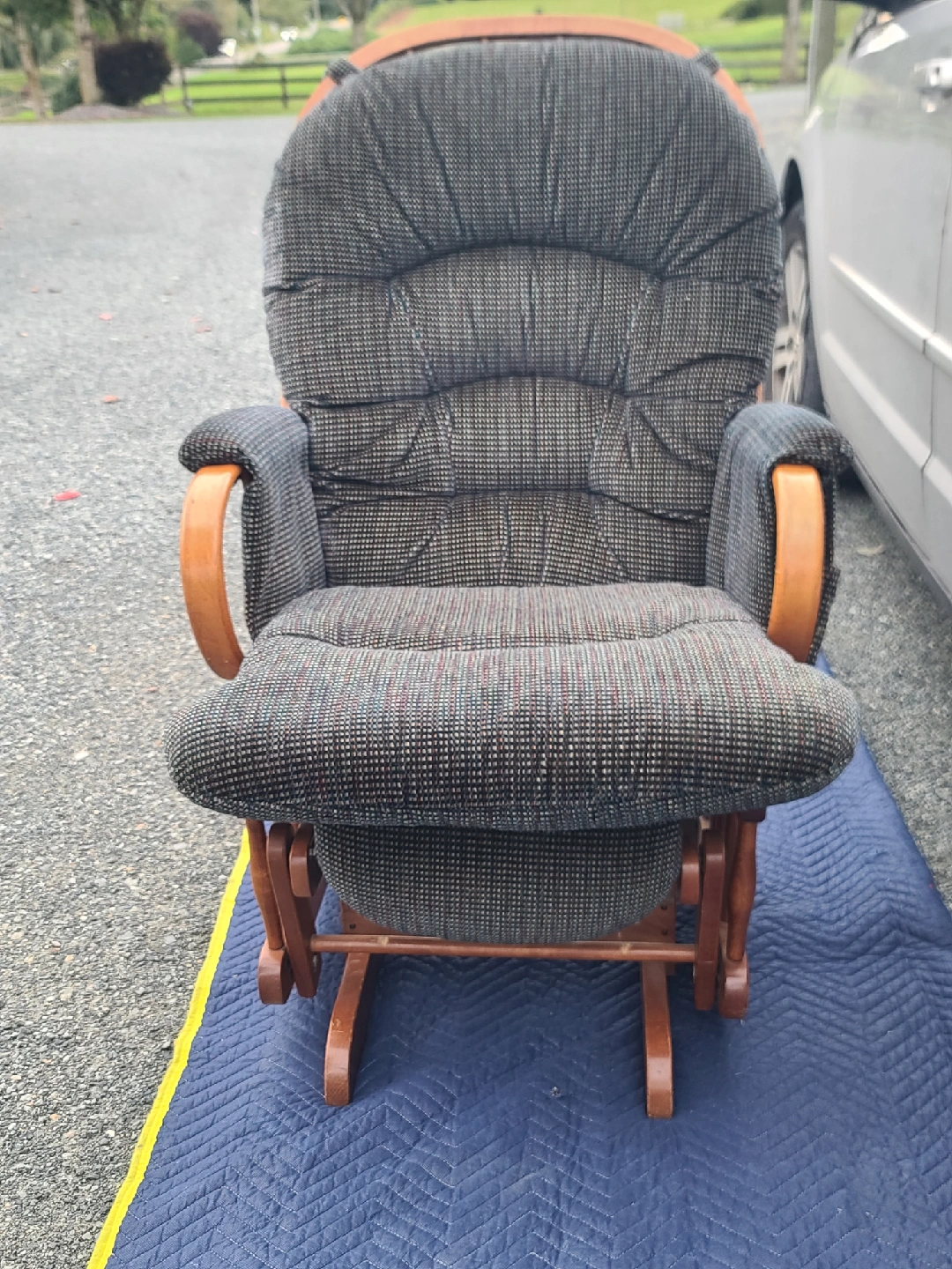 A comfy glider rocking chair! It's in good condition and would be perfect for a nursery or living room. The cushions are soft and supportive, making it a great place to relax and unwind after a long day. Measurements to follow. Delivery can be arranged. Viewing and pickup by appointment
