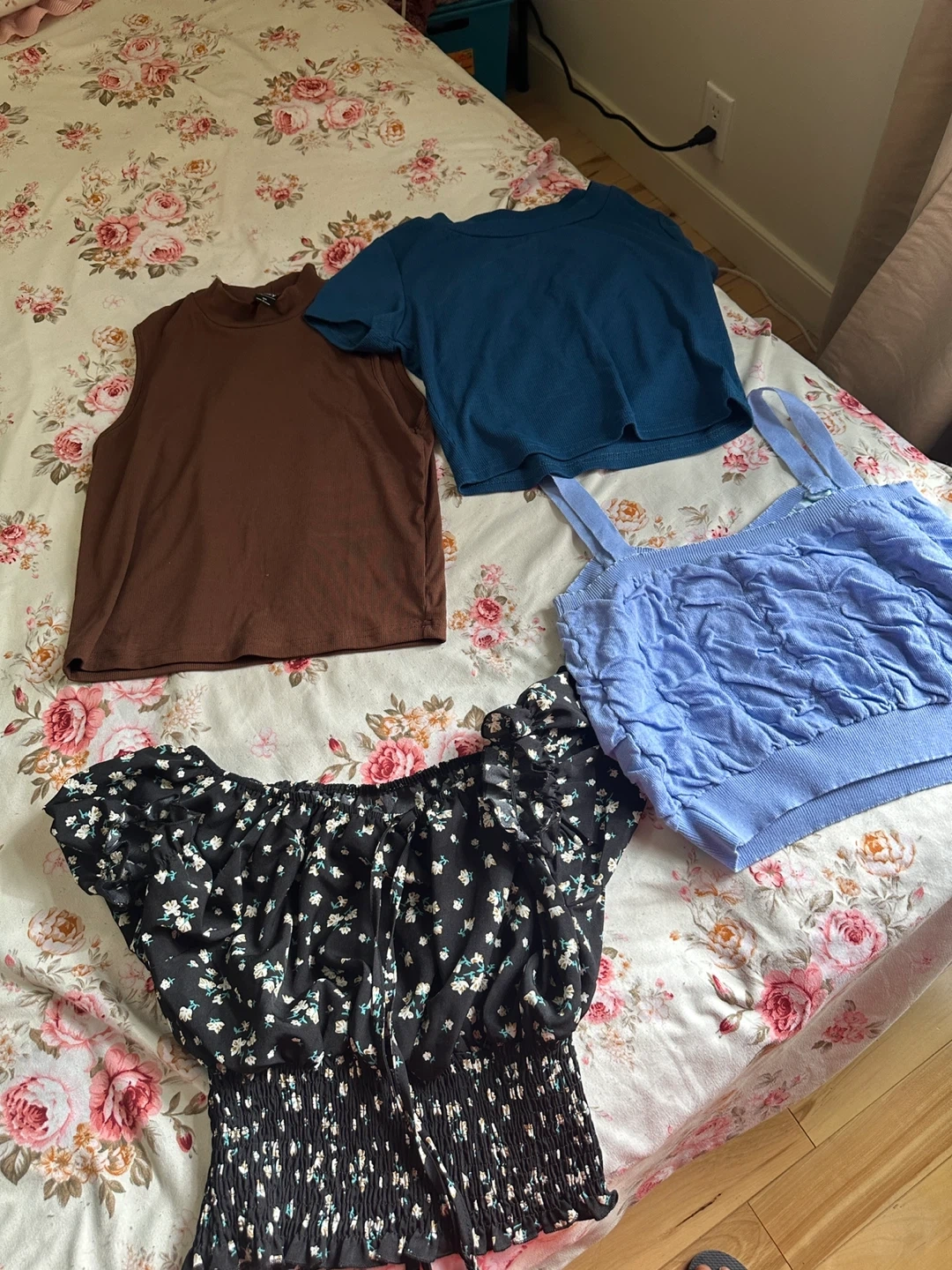 Selling a collection of women's tops in various styles and colors! There's a brown sleeveless top, a teal short-sleeve crop top, a light blue tank top, and a black floral off-the-shoulder top. All in good condition!