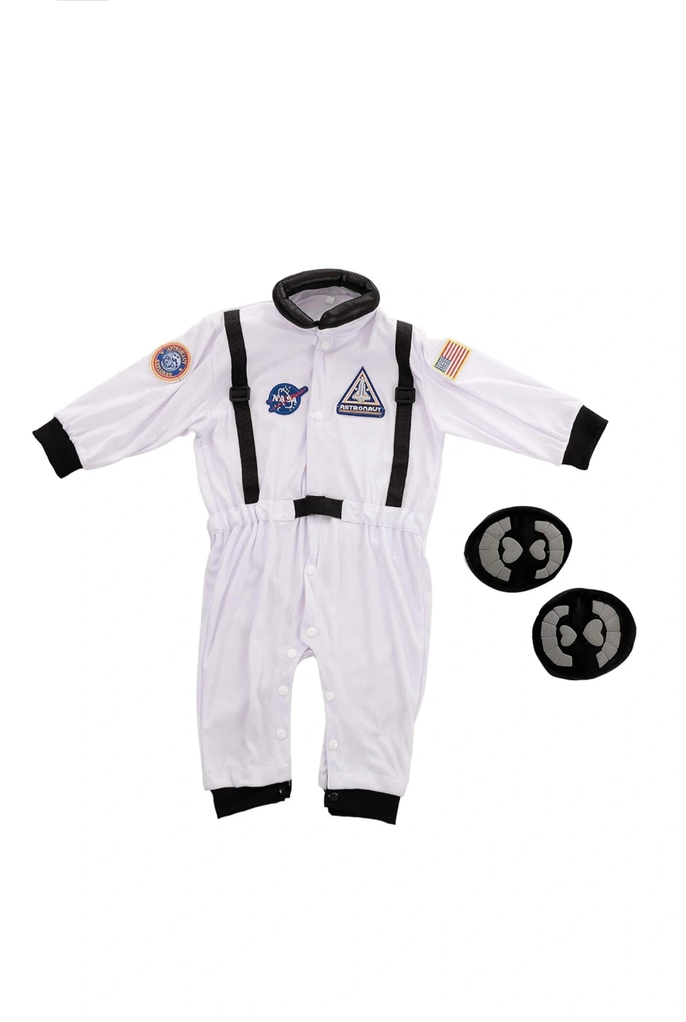 Get ready for liftoff with this adorable toddler astronaut costume! This white jumpsuit features NASA and astronaut patches, along with attached black straps for an authentic look.