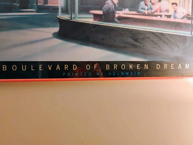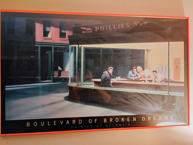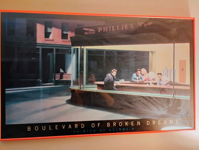 Own a piece of art history with this framed "Boulevard of Broken Dreams" print, a captivating piece that brings a touch of melancholic charm to any room. This print features the iconic imagery reminiscent of Edward Hopper's "Nighthawks," reimagined with a cast of beloved pop culture icons. The print comes framed, ready to hang and admire.