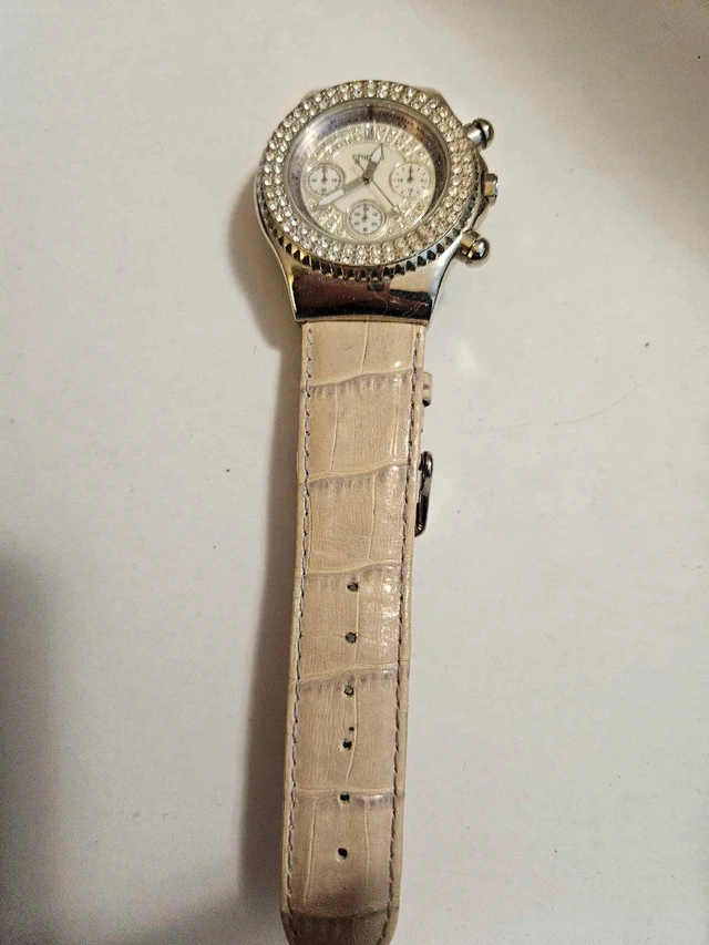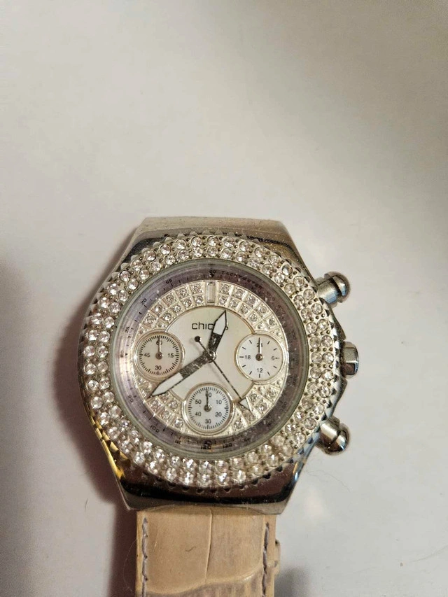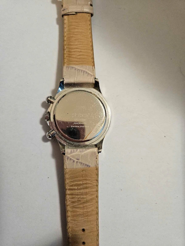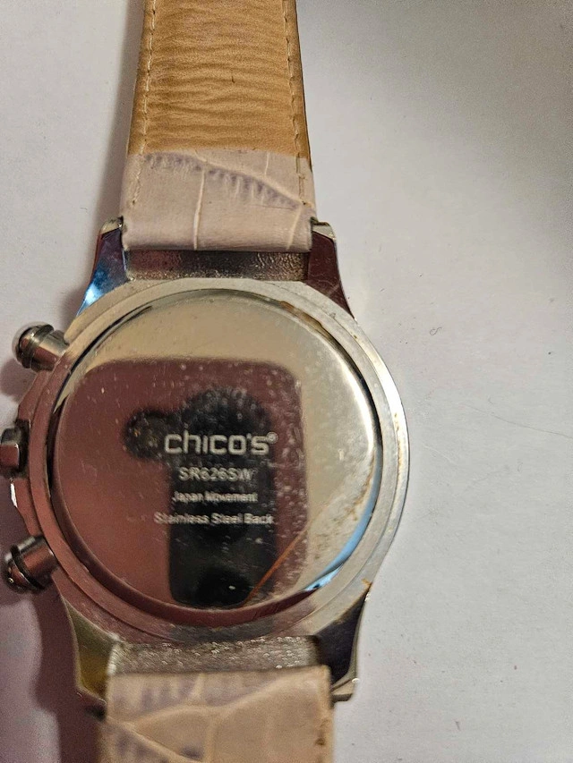 This is a used Chico's watch featuring a stylish design with crystal embellishments around the face. This timepiece is perfect for adding a touch of sparkle to your wrist! Needs a new battery.