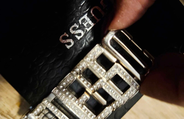 This used Guess watch features a rectangle face, stainless steel bracelet and decorative crystals. It's a very eye-catching accessory. Adjustable length, with easy add links. Comes with box for gift giving. Needs new battery.