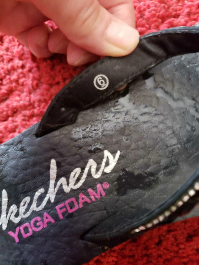 Size 6, skechers yoga foam saddles. Excellent condition. A couple tiny sparkles fell off but not noticeable. Non smoking home I just haven't really worn them. Let me know if you're interested!