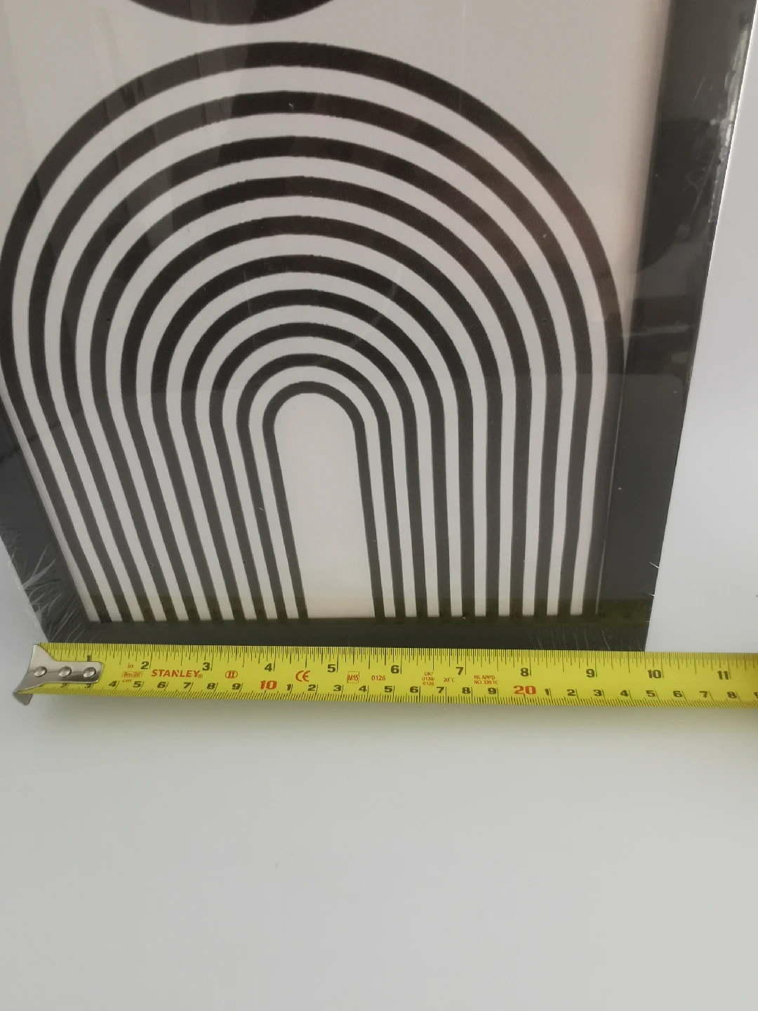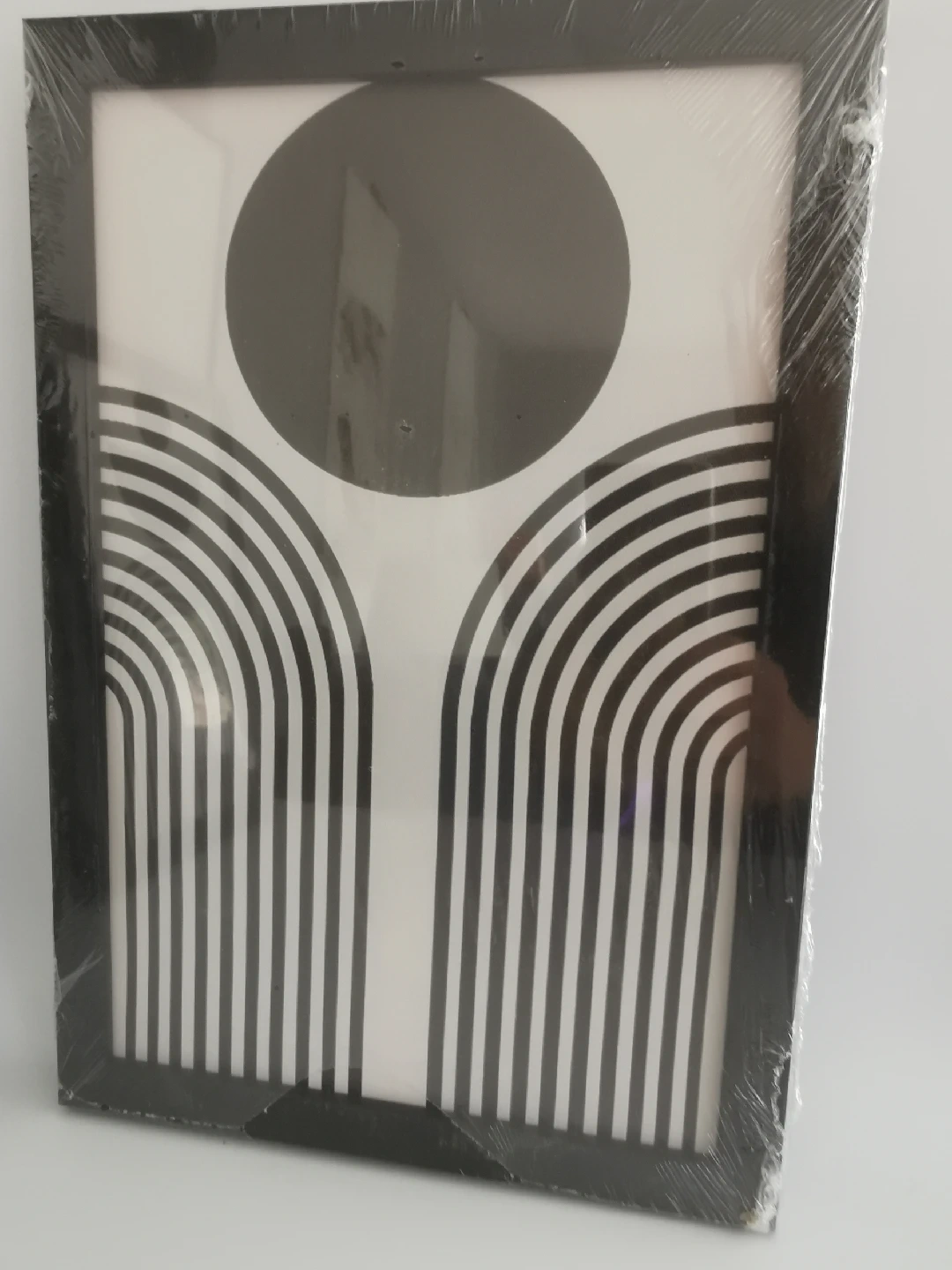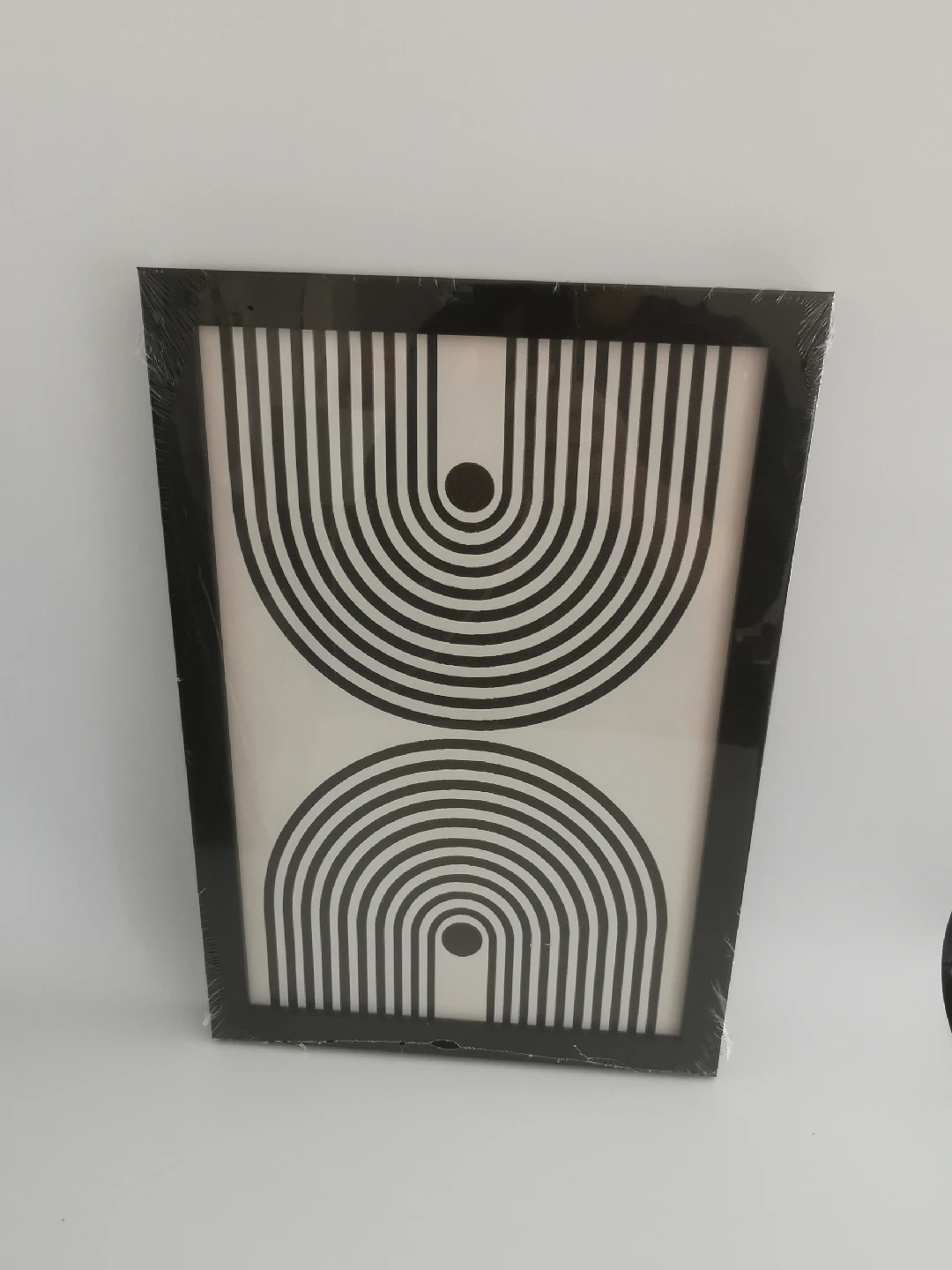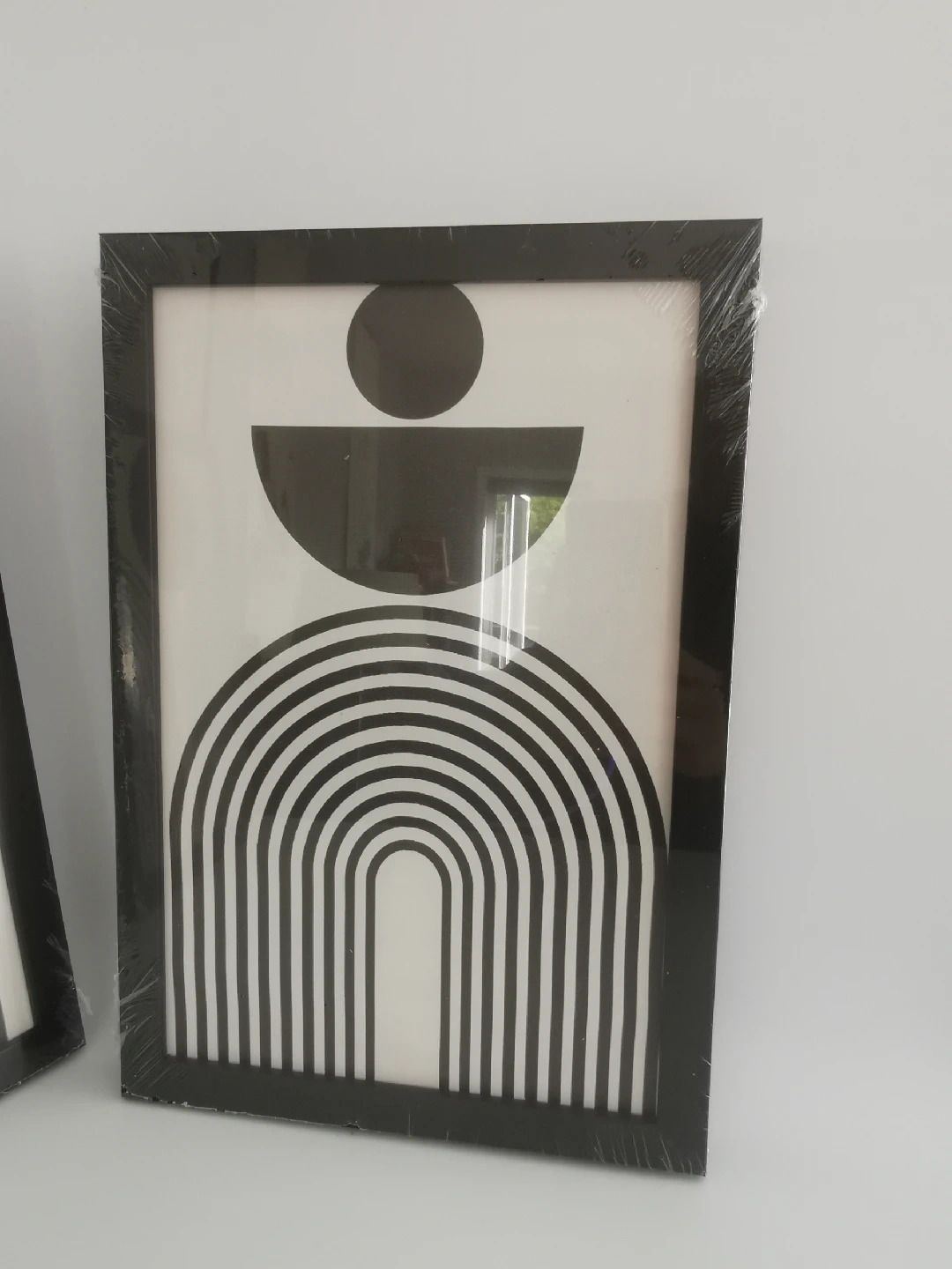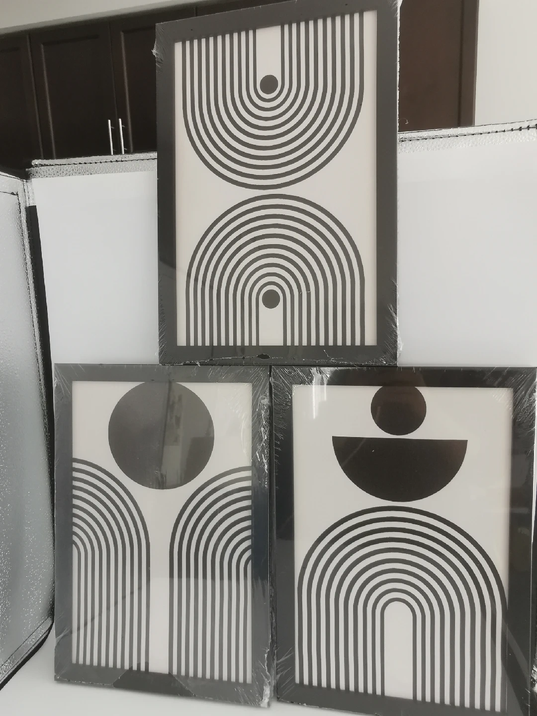Add a touch of modern elegance to your space with this set of three framed art pieces, each featuring a unique geometric design in black and white. These pieces measure approximately 15 inches in height and 10 inches in width, making them ideal for creating a gallery wall or accentuating any room. * **Dimensions:** Approximately 15" x 10" * **Design:** Geometric patterns in black and white * **Condition:** New, still sealed in original packaging Spruce up your living space with these eye-catching prints. They're so stylish, they might just start a conversation or two! Don't miss out on adding this contemporary flair to your home decor. Pickup at Bur Oak @ McCowan Markham, or at 70 Queens Wharf Rd, downtown Toronto around noon most of Sundays