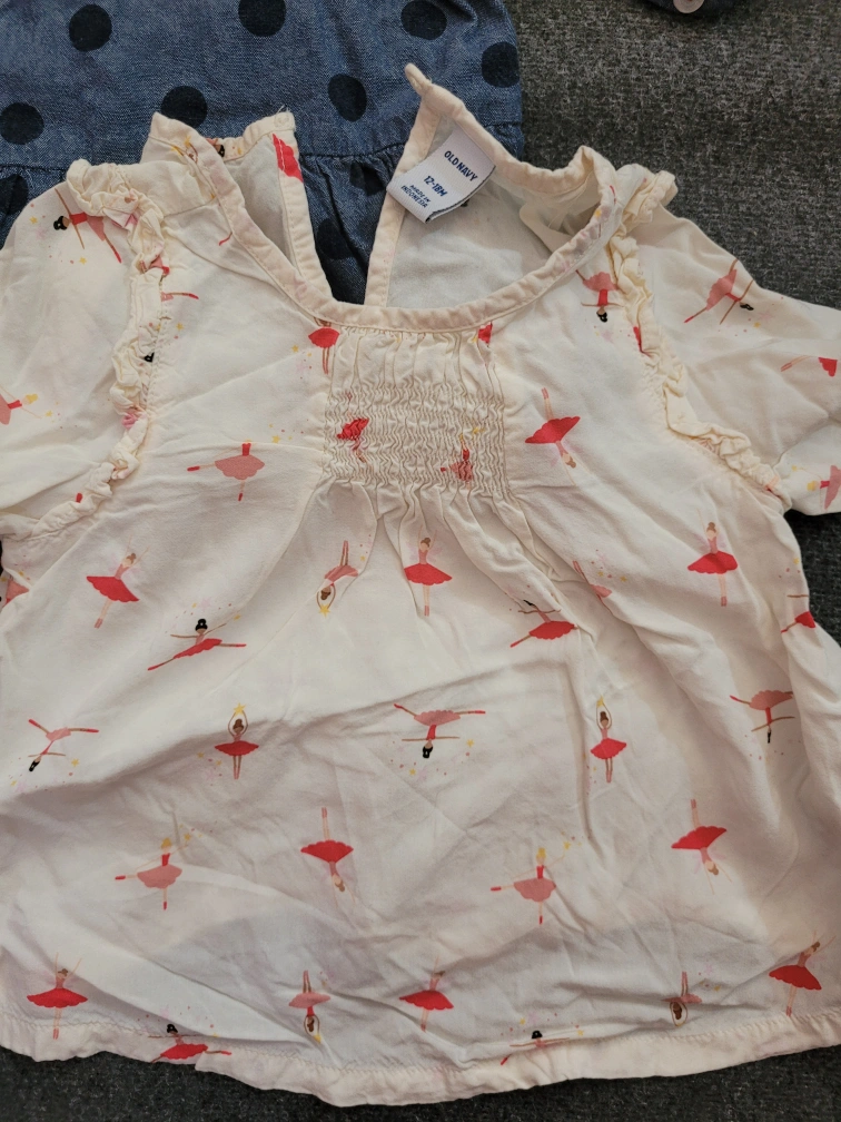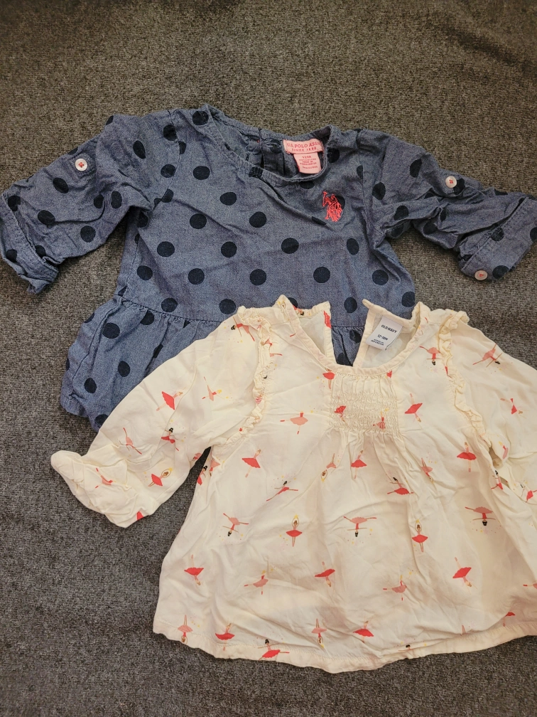 Selling two adorable baby tops! One is from Old Navy, size 12-18 months, with a cute ballerina print. The other is a U.S. Polo Assn. top, also size 12-18 months, with a polka dot pattern