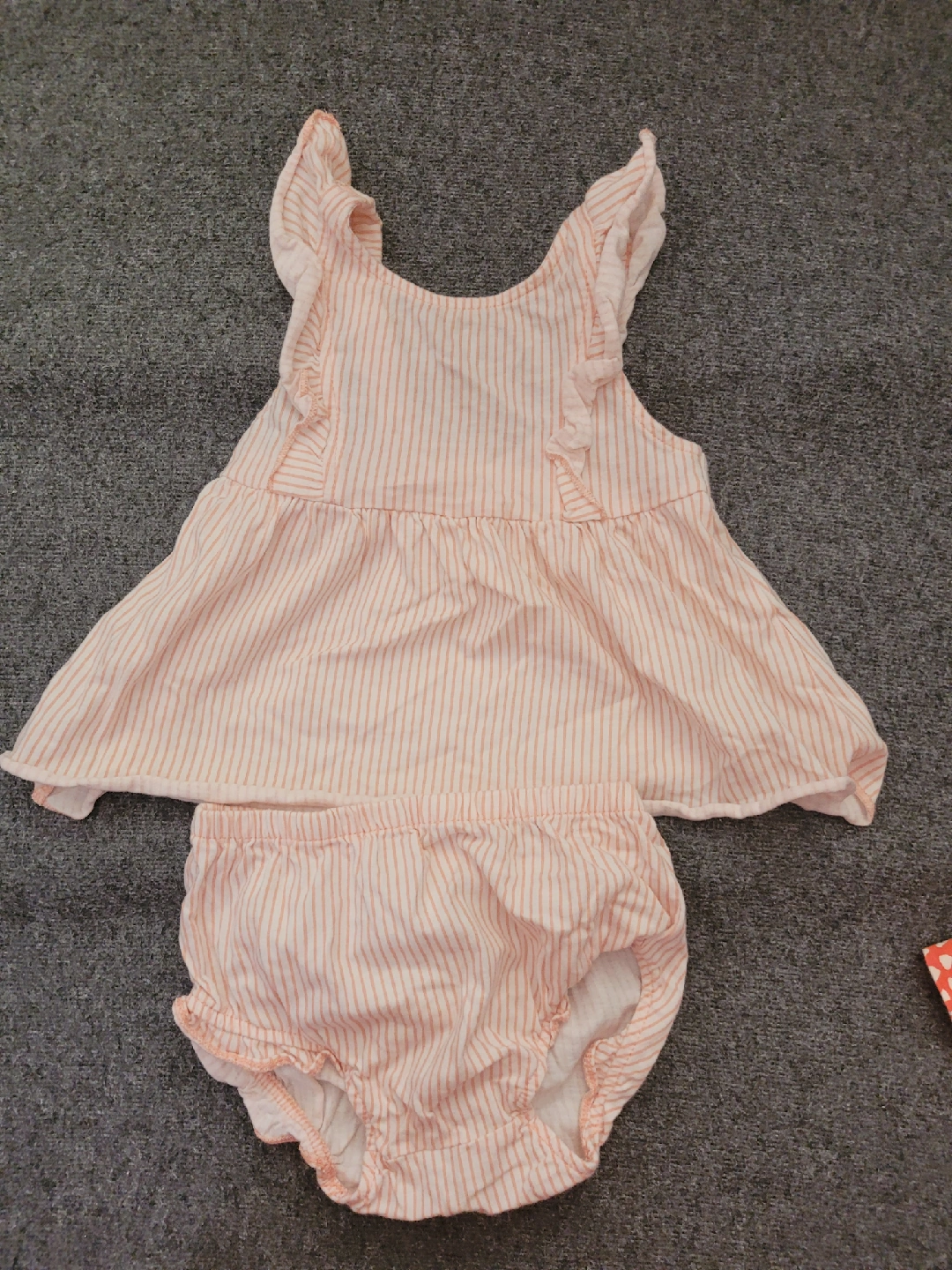 Selling a cute lot of baby dresses from Carter's! Includes a brown patterned dress with matching bloomers (size 6M) and an orange pineapple print dress (size 9M). Perfect for your little one!
