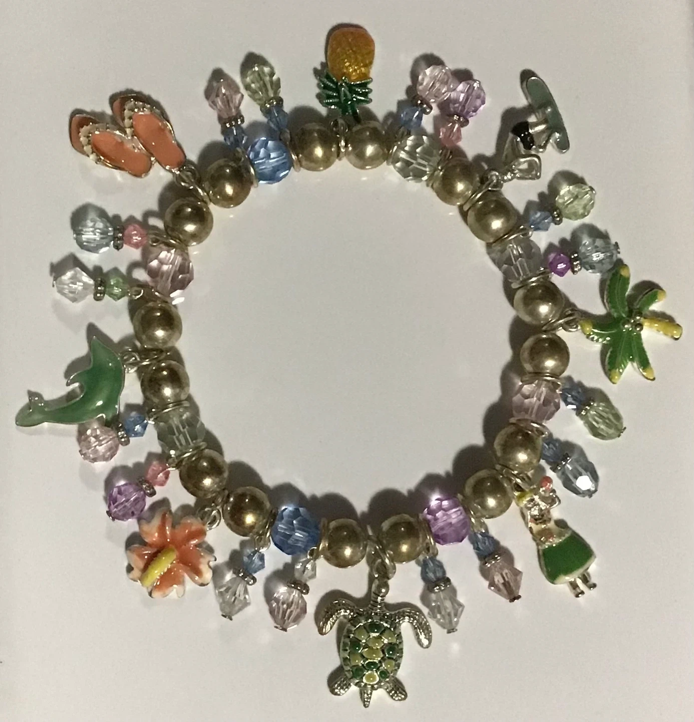 88I'm selling a bracelet made of small, white and light peach-coloured shells. It also has a silver-tone metal chain bracelet with a turtle charm. It's in great condition and would make a cute addition to your jewellery collection. Pictures show size, all as is Info in photo Exact cash only $3.00 each Tropical charm bracelet $5.00