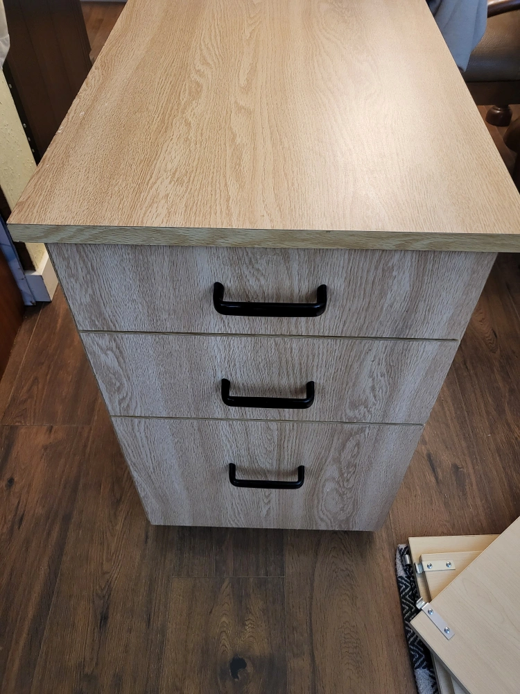 Damage to the rear end of the cabinet so it needs some height assistance. Priced accordingly.