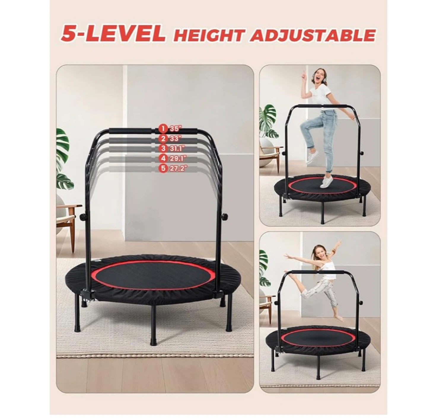 This trampoline is designed for full-body fitness, with a thickened steel frame and non-slip footpads. It supports up to 330 lbs and can be folded for easy storage. The adjustable handle makes it suitable for various exercises.