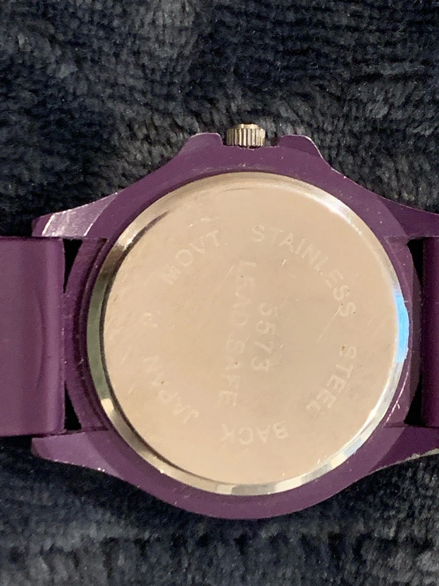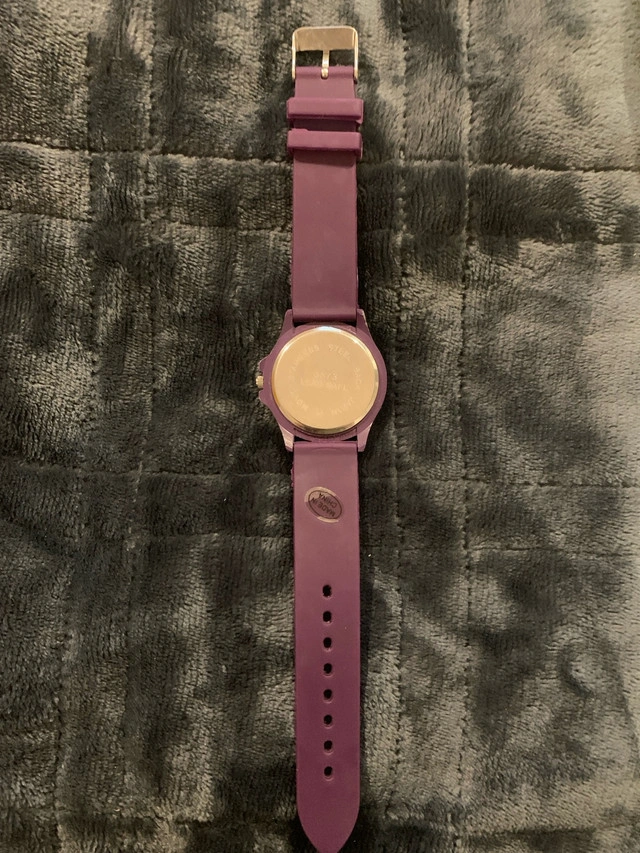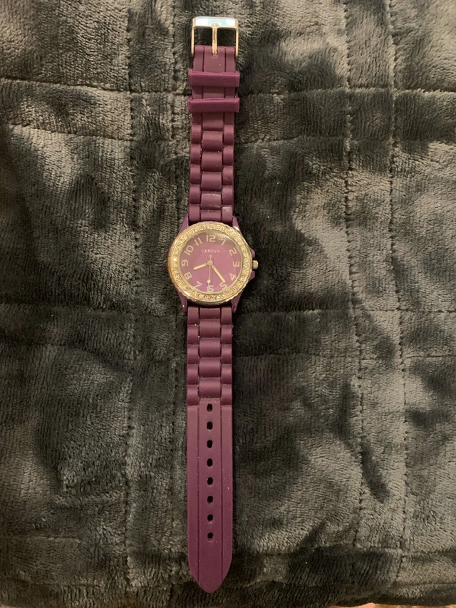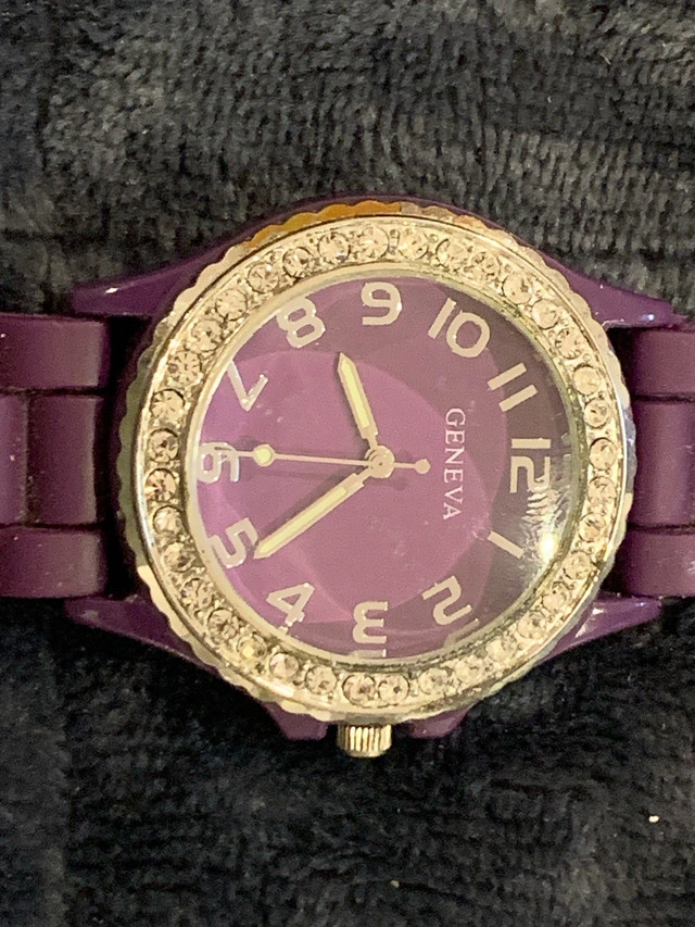 This Geneva quartz watch comes on a purple silicone wrist band. Watch is running and comes with a battery installed.