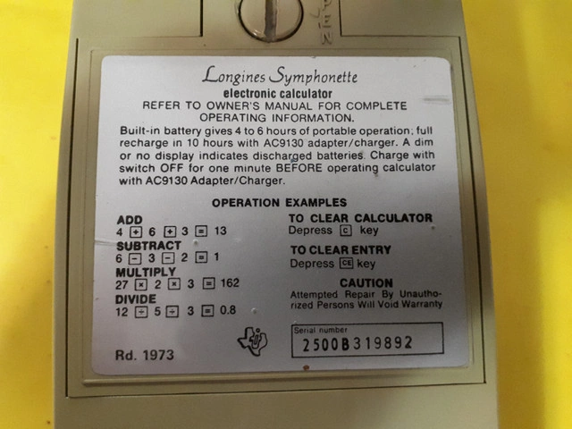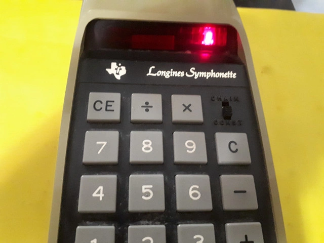 Longines Symphonette Electronic Calculator (TI-2500B) for sale as is. Exterior of calculator is in mint condition. However, the calculator only turns on for a few seconds and then goes off (see video). No power cord.