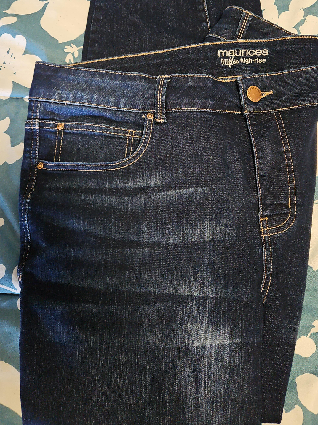 Selling a pair of maurices Everflex high-rise jeans. They are in great condition! The jeans are a dark wash denim, perfect for everyday wear.