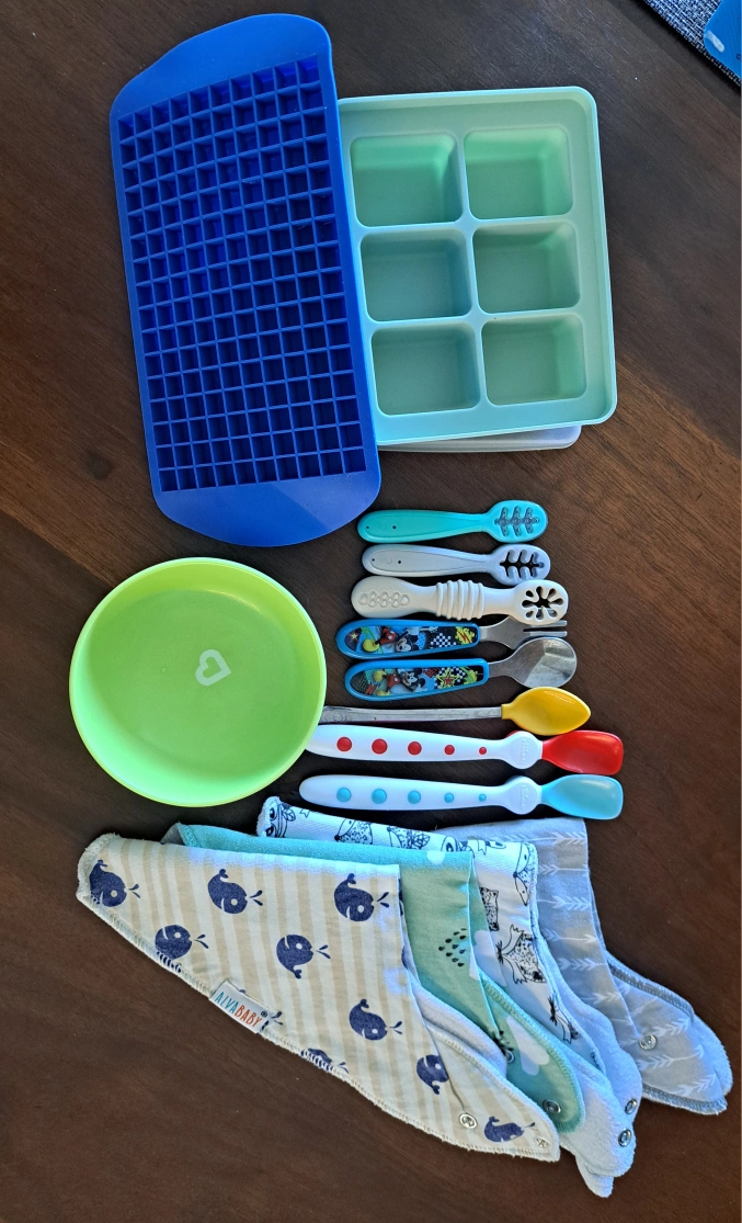 Selling a baby feeding set that includes bibs, a variety of spoons, a bowl with suction and freezing trays for purees. Perfect for starting solids.