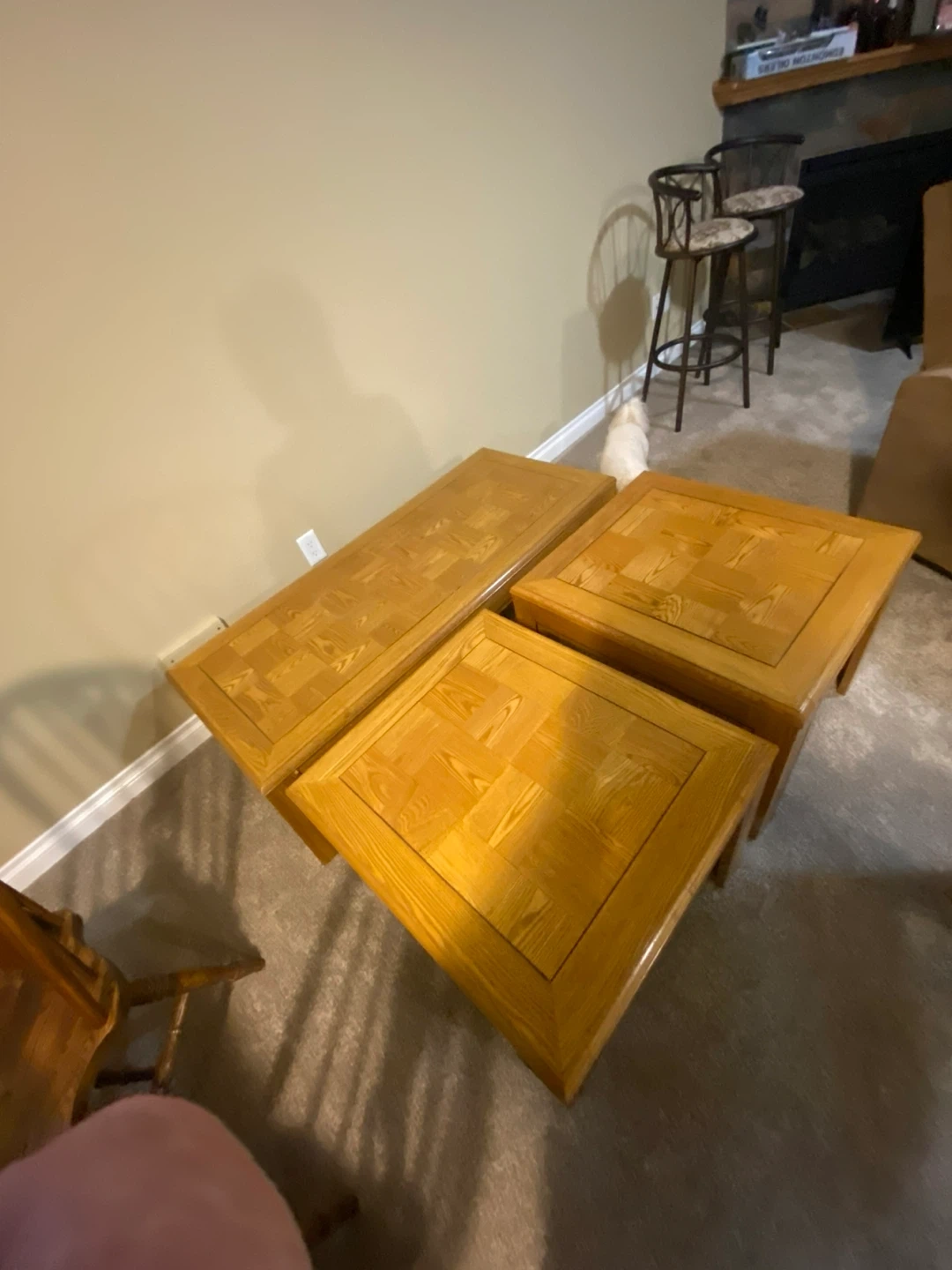 Selling a coffee table and end tables. They're in good condition and have a lovely pattern on top. Perfect for adding some extra surface space when you need it!