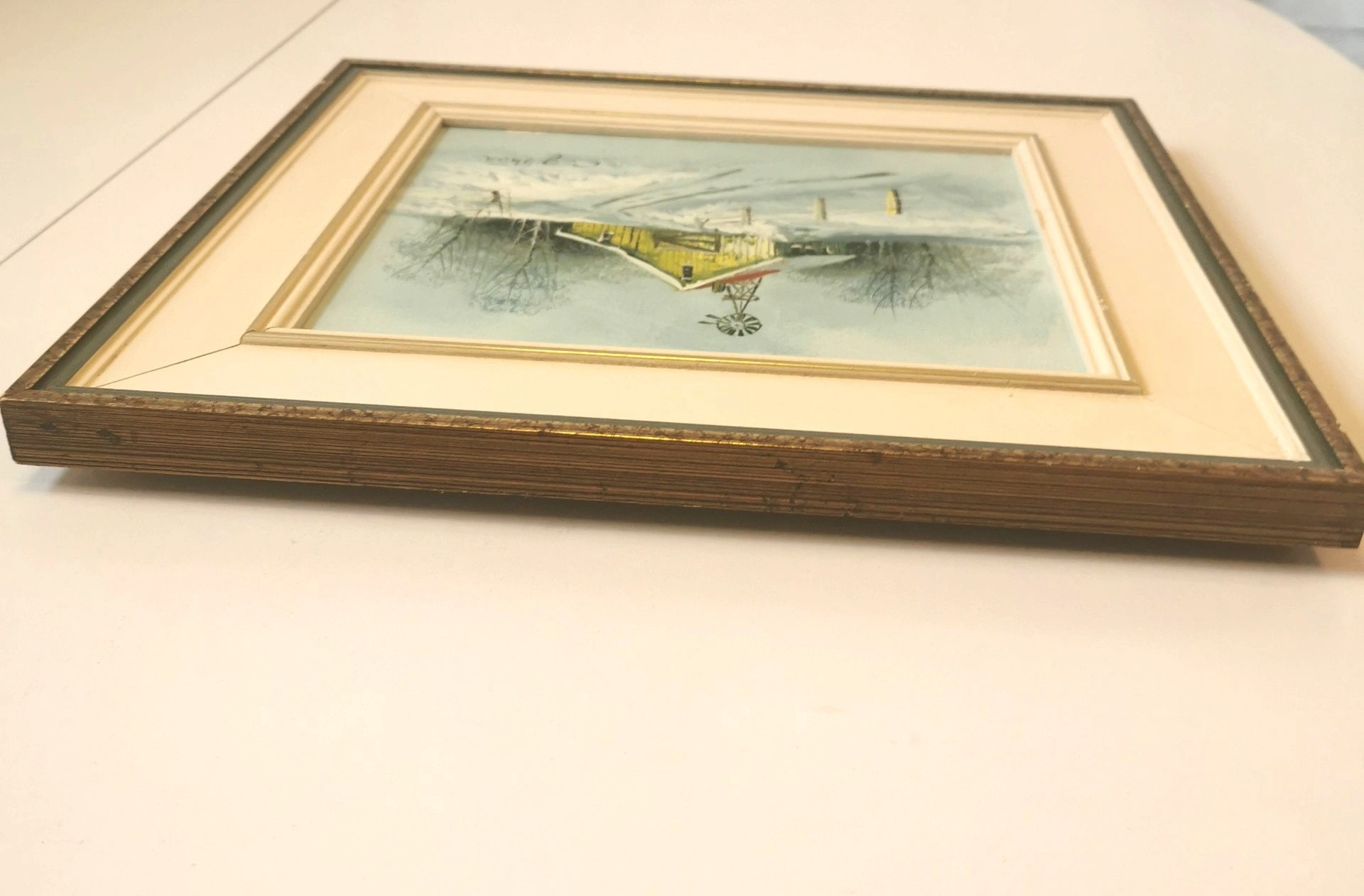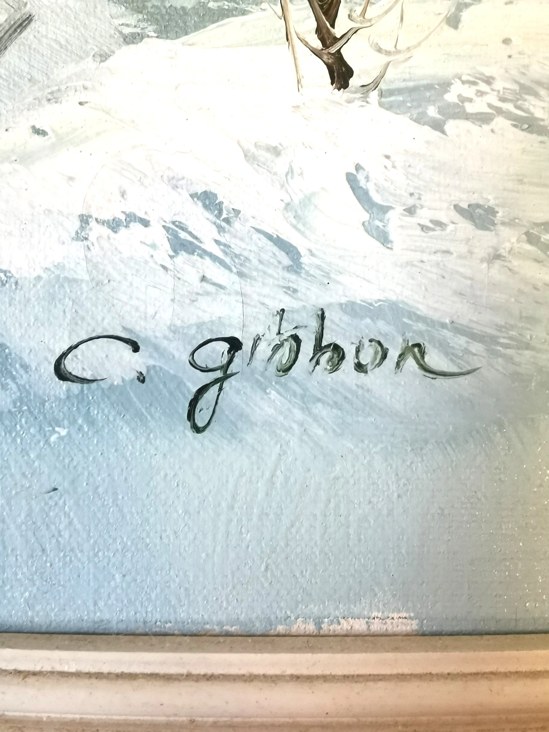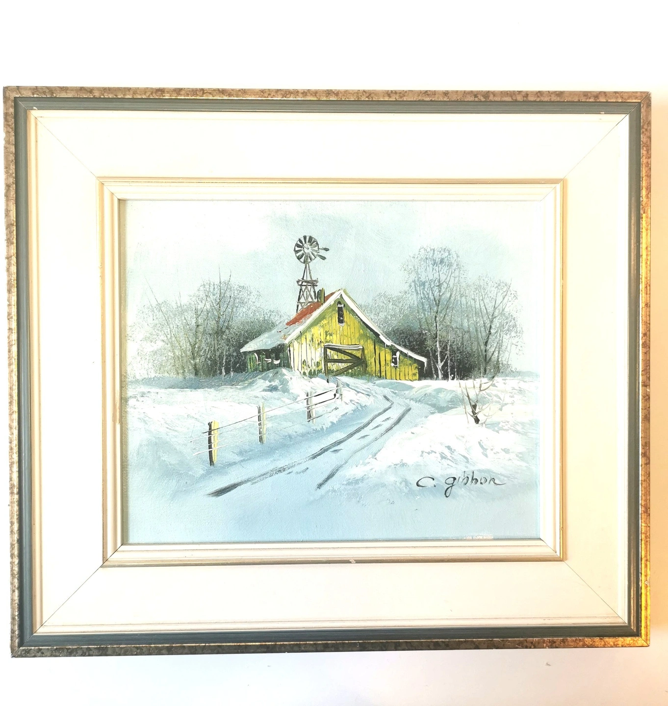 62Vintage original oil painting by C. Gibbon, depicting a rustic yellow barn with windmill in a snowy winter landscape. This hand-painted scene captures the charm of rural country life with vibrant color and textured brushwork. Artist: C. Gibbon (signed) Medium: Oil on canvas (framed) Subject: Winter barn, windmill, snow scene Era: Mid-20th century vintage Dimensions (framed): 14.5" height x 12.75" width x 1.5" depth Condition: Good vintage condition with minor wear consistent with age please reference photos as they are part of the description. Frame: Included, wood frame adds a classic rustic touch A beautiful addition to farmhouse, rustic, or country-style décor. Collectible vintage artwork that brings warmth and character to any room. Ships carefully packed to ensure safe delivery. Show less
