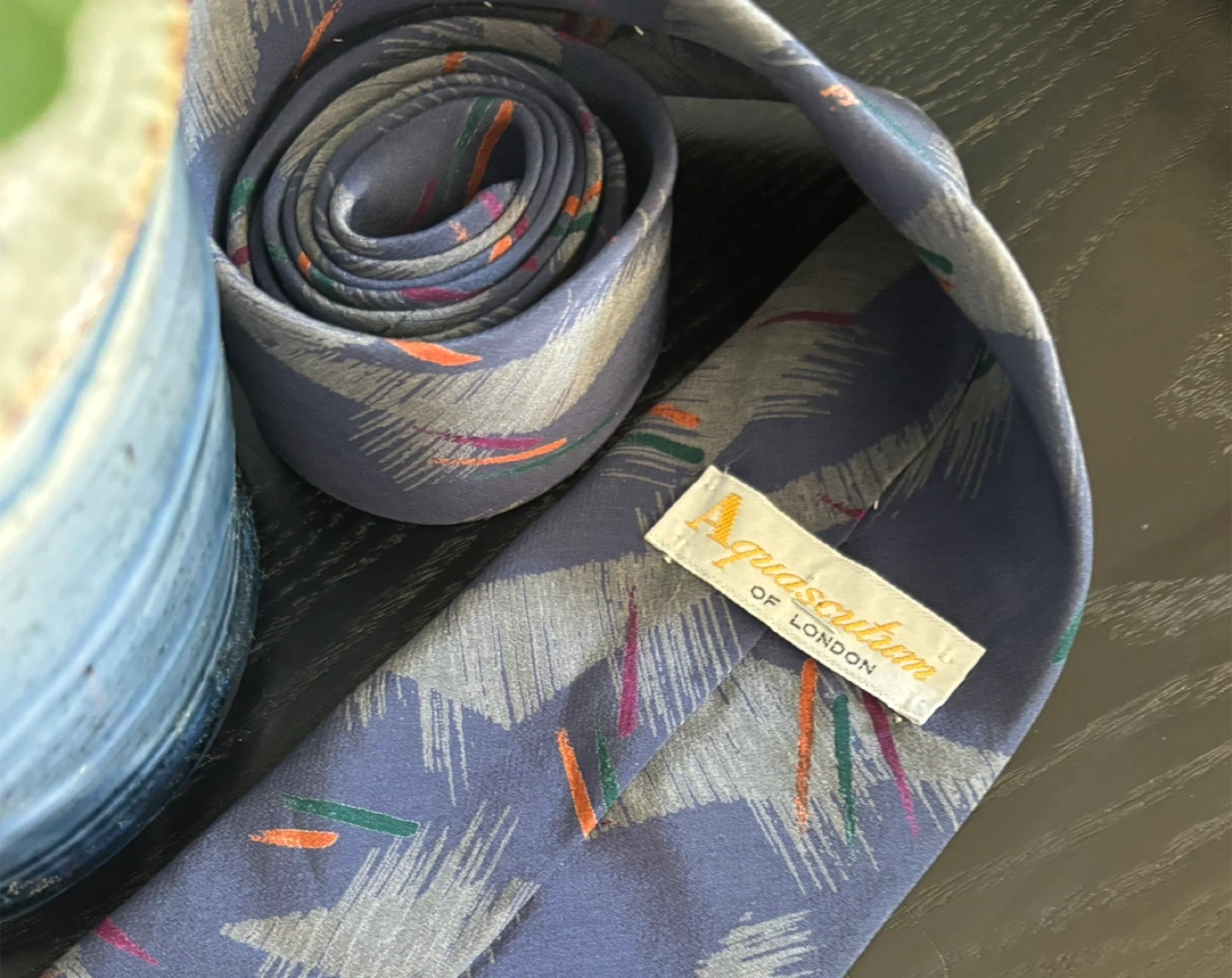 Vintage Aquascutum of London 100% silk tie geometric pattern, in blue|grey and hint of burgundy|green and orange.
