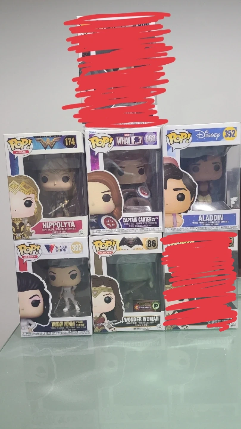 Selling a collection of Funko Pop! vinyl figures. Includes Lust (Fullmetal Alchemist #898) - SOLD,, Hippolyta (#174), Captain Carter (#968), Aladdin (#352), and Wonder Woman (#86 & #382). All figures are in their original boxes!
