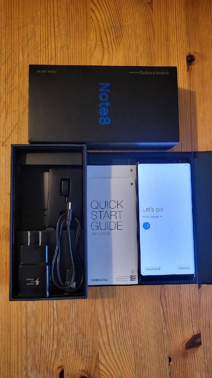 Selling a Samsung Galaxy Note 8 with 64GB of storage. It comes with the original box and all the included accessories, including the charger and quick start guide. It's in great condition and ready for a new owner. There is a small crack on the lower left corner. Factory data reset now.