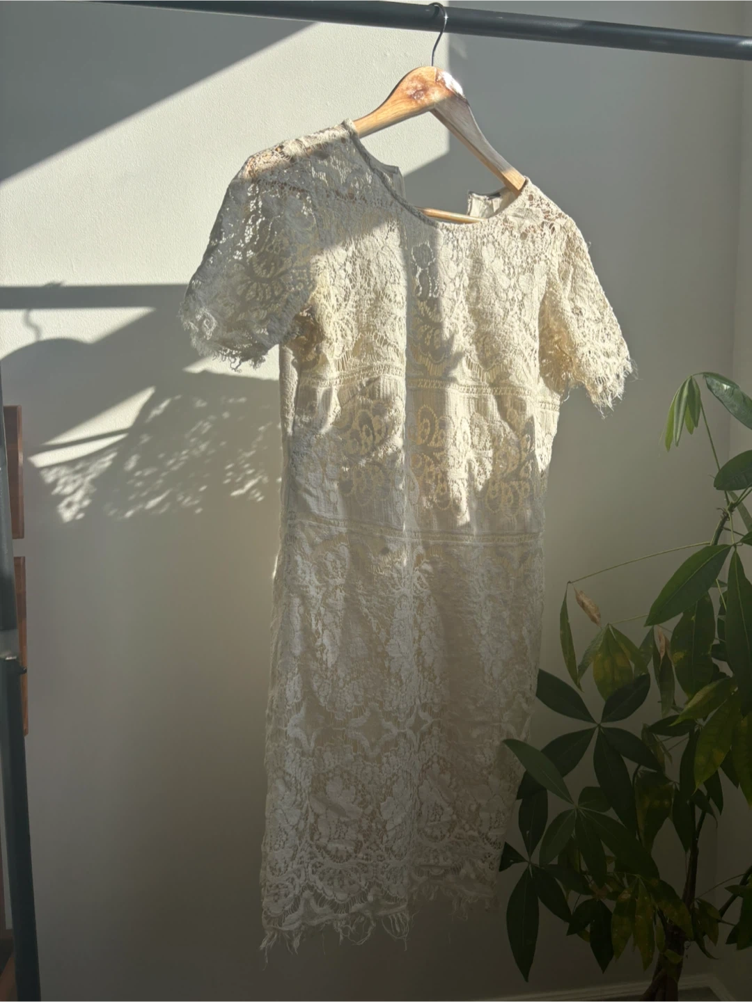 Selling a beautiful Free People lace mini dress in ivory! It's in great condition and perfect for a special occasion or a night out. The delicate lace detailing gives it a unique and elegant look. It's a size medium / size 8.