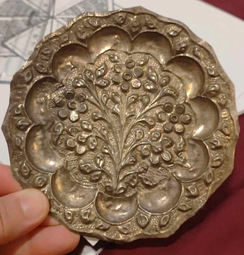 Selling a vintage silver decorative plate. It has a beautiful floral design and intricate details. It's in good condition and would make a lovely addition to any home decor