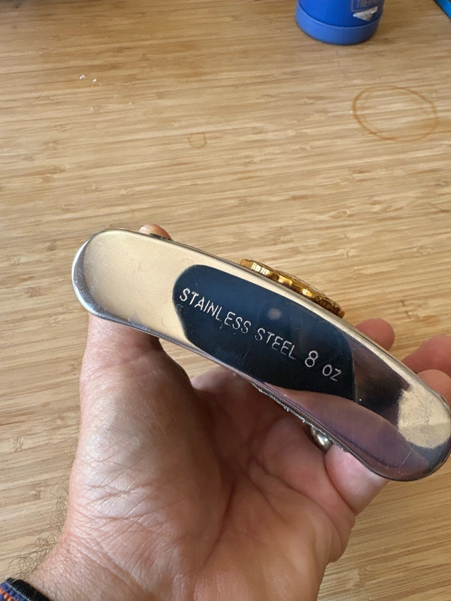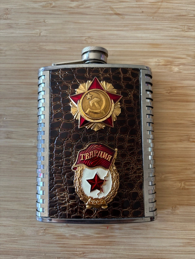 I'm selling a vintage-style stainless steel flask, perfect for collectors or anyone who appreciates unique barware. This 8oz flask features decorative Soviet-era emblems on a faux-leather background, giving it a distinctive, retro look. It's in good condition.