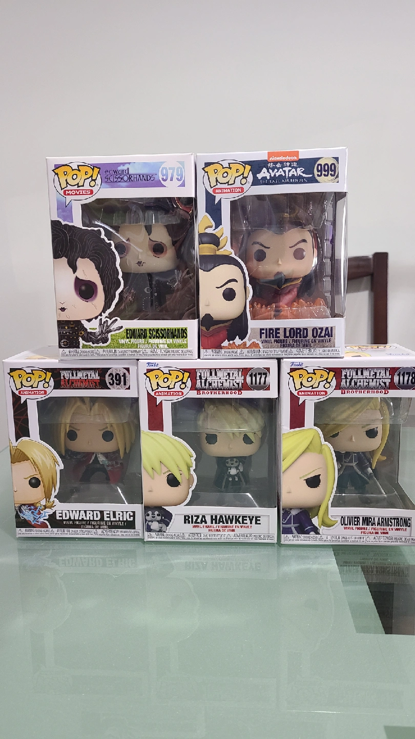 73Selling a collection of Funko Pop! figures from various animation series! Included are Edward Scissorhands (979), Fire Lord Ozai (999), Edward Elric (391), Riza Hawkeye (1177), and Olivier Mira Armstrong (1178) Prices for each.