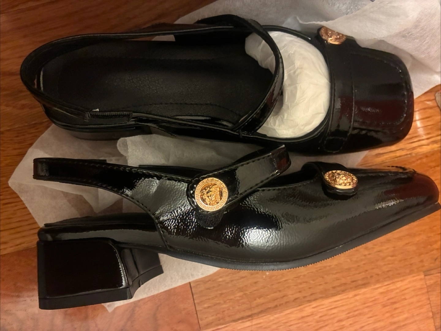 Selling a pair of black patent leather slingback heels. They are in great condition and have a small block heel. Perfect for dressing up or down!