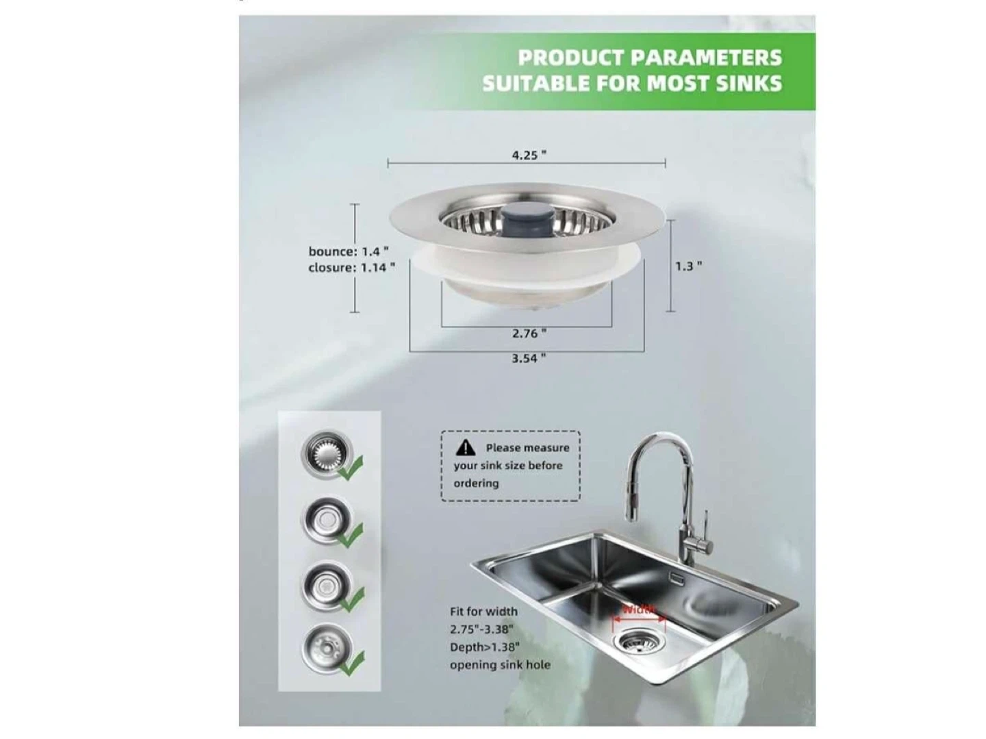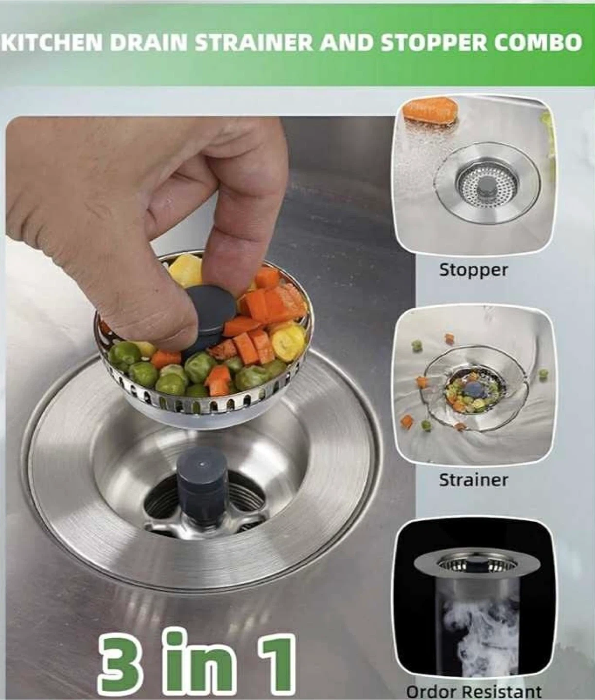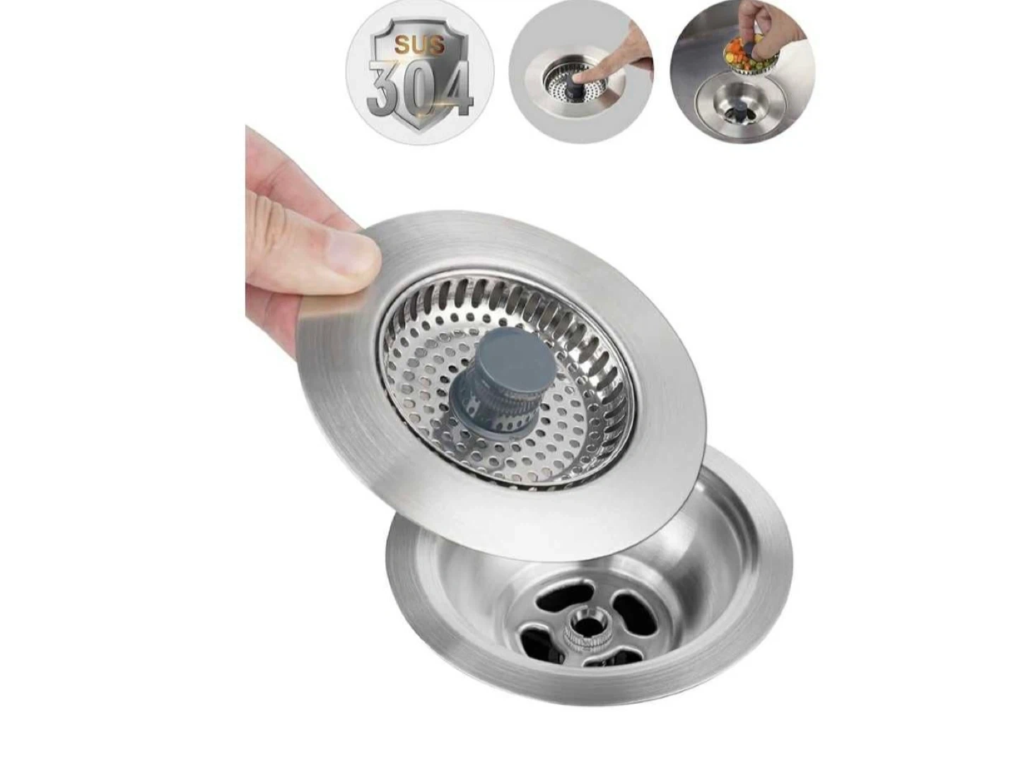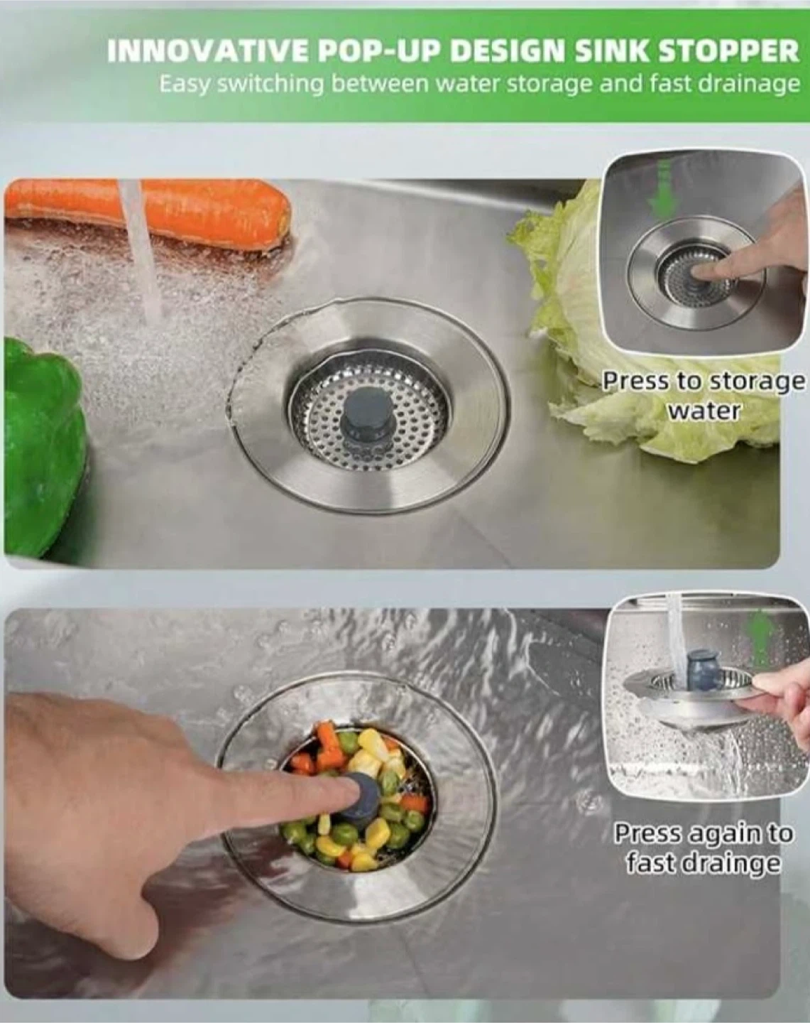 248This is a kitchen drain strainer and stopper combo. It's a 3 in 1 design that includes a stopper, strainer, and odor resistant features. It's made of SUS 304 stainless steel and is suitable for most sinks. It has an innovative pop-up design for easy switching between water storage and fast drainage
