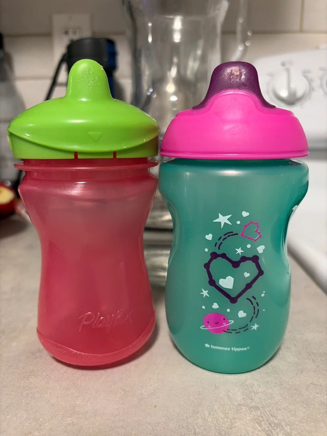 375two sippy cups! One is a Playtex cup in pink with a green lid. ready for a new home! Pickup near Jean and Eglinton