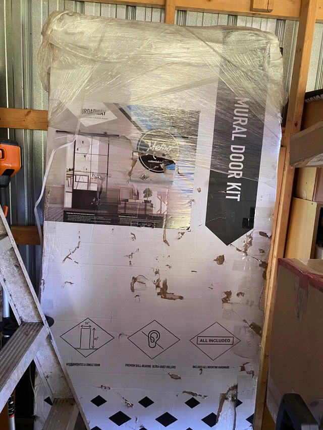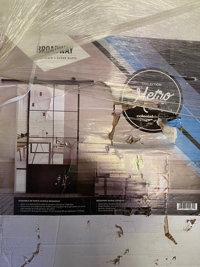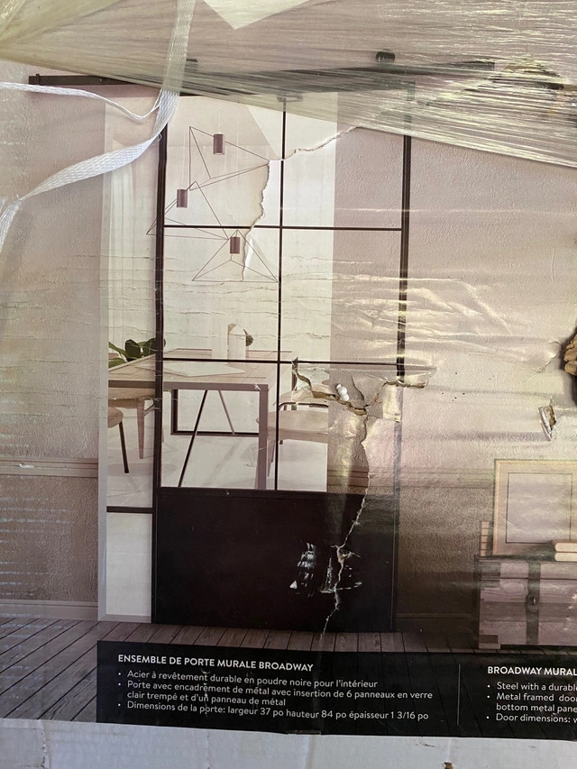 Broadway mural door kit all included steel with durable black powder coated finish for interior applications. Metal frame door with six tempered glass panels accented by a bottom metal panel. Door dimensions: 37 inches height, 84 inches, thickness 1 3/16. New in box, did not use in renovations. Retails for $650.