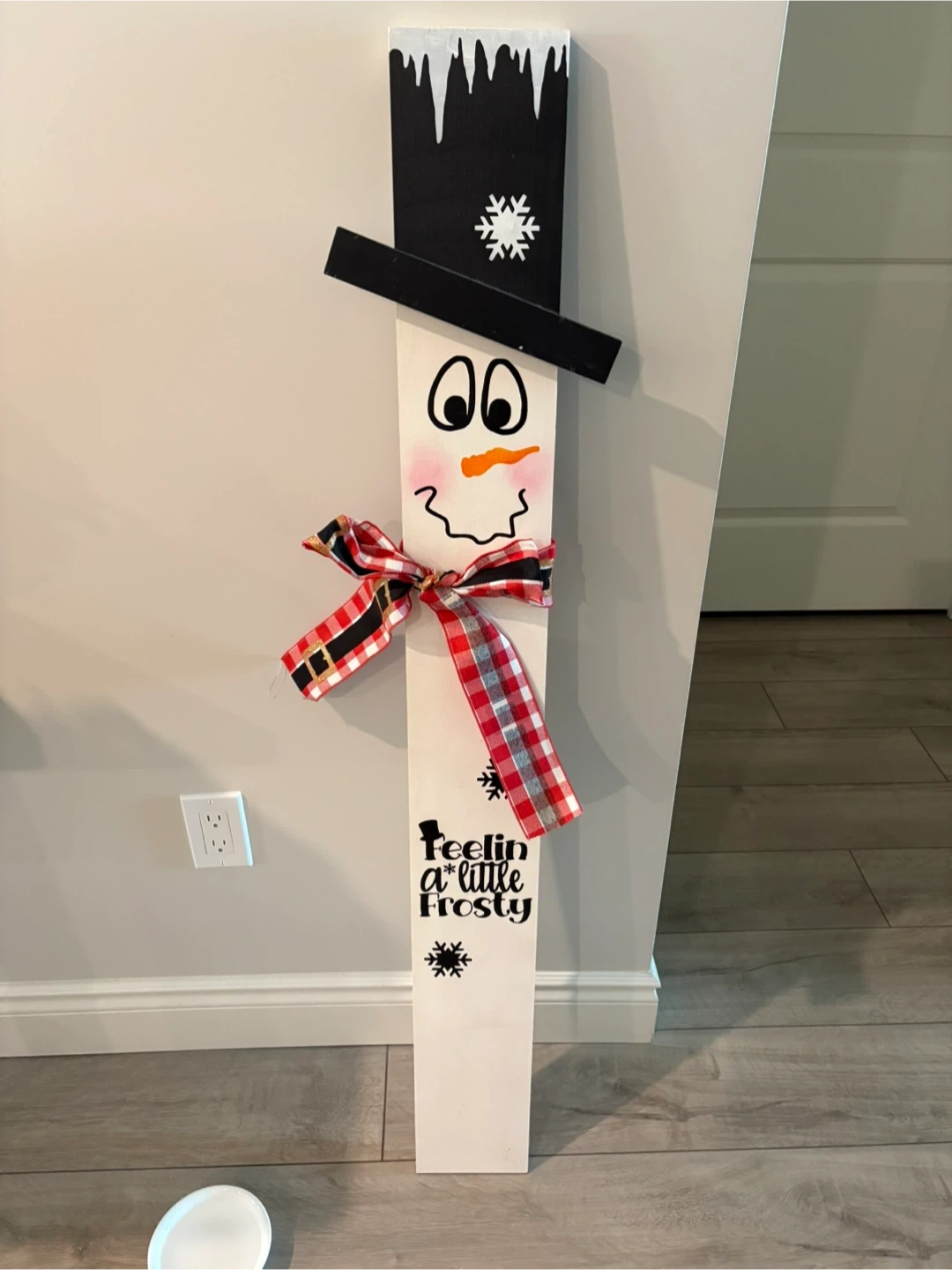 10Cute handmade wooden snowman decoration! It's got a little hat and a festive red and white checkered bow. It says 'Feelin' a little Frosty' at the bottom. Perfect for adding a touch of winter charm to your home!