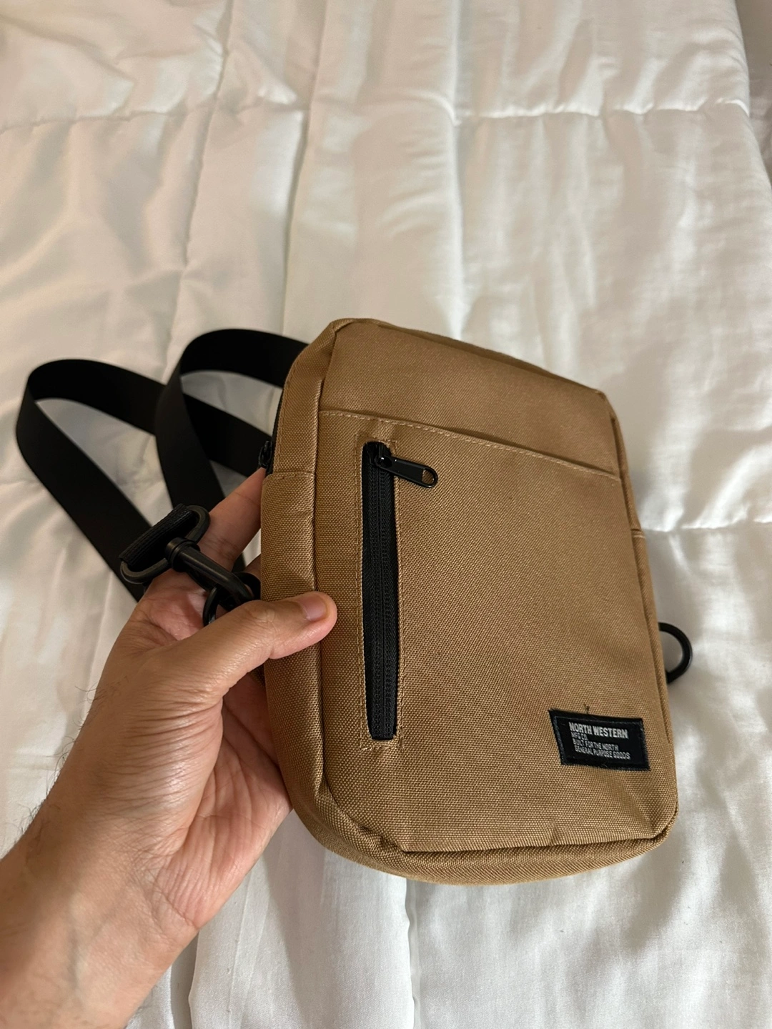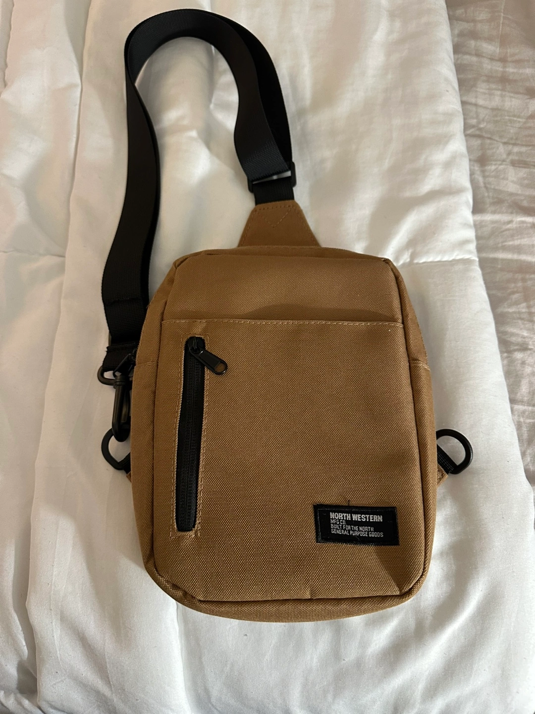 Selling a North Western Goods sling bag. It's a great size for carrying your essentials. The bag is in excellent condition and features a convenient front zipper pocket. Perfect for everyday use!