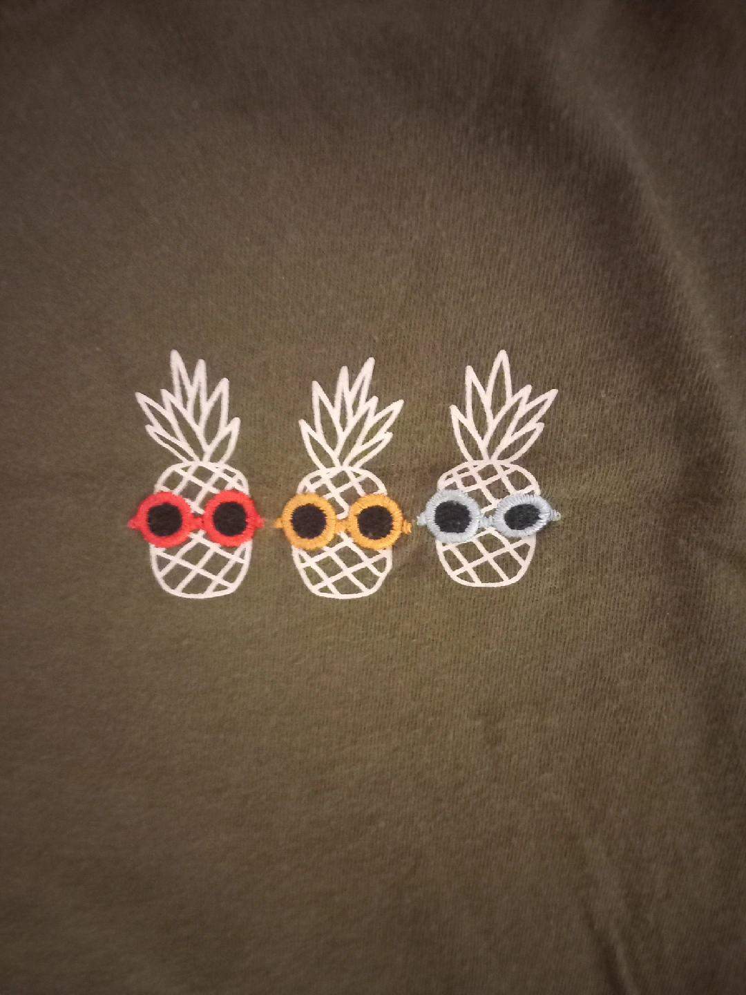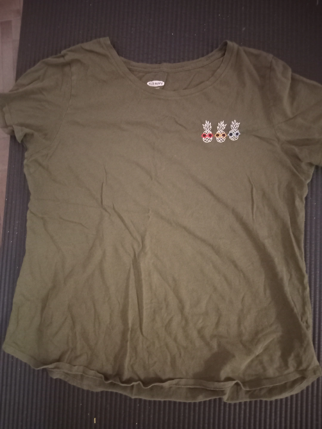 277This is an olive green T-shirt from Old Navy. It's a size L and has a cute design of three pineapples wearing sunglasses!