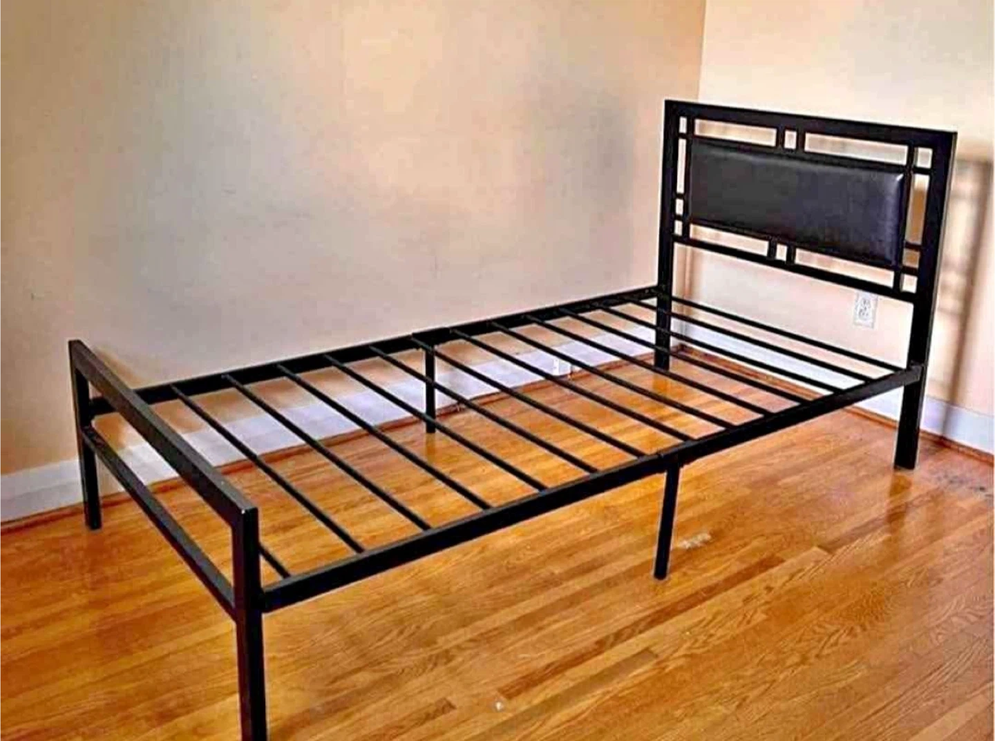 Selling a black metal twin bed frame! It's in great shape and ready for a new home. Perfect for a small space or guest room. The headboard features a simple, modern design with a rectangular padded insert.