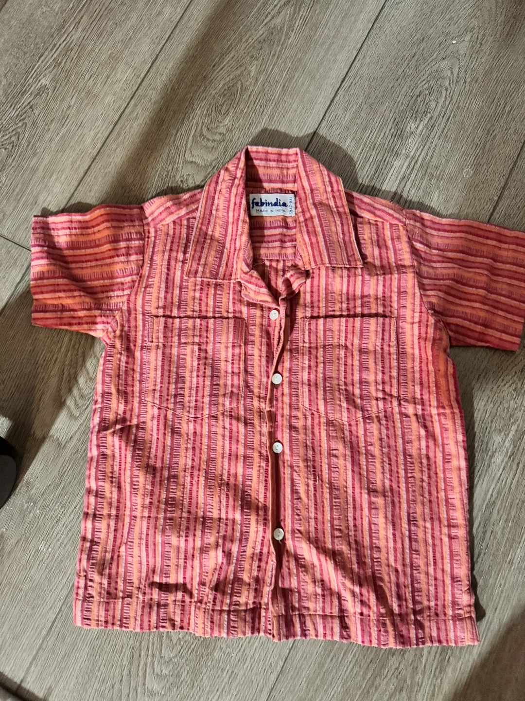 two adorable kids' shirts! One is from Fabindia, featuring a vibrant orange and pink striped pattern.