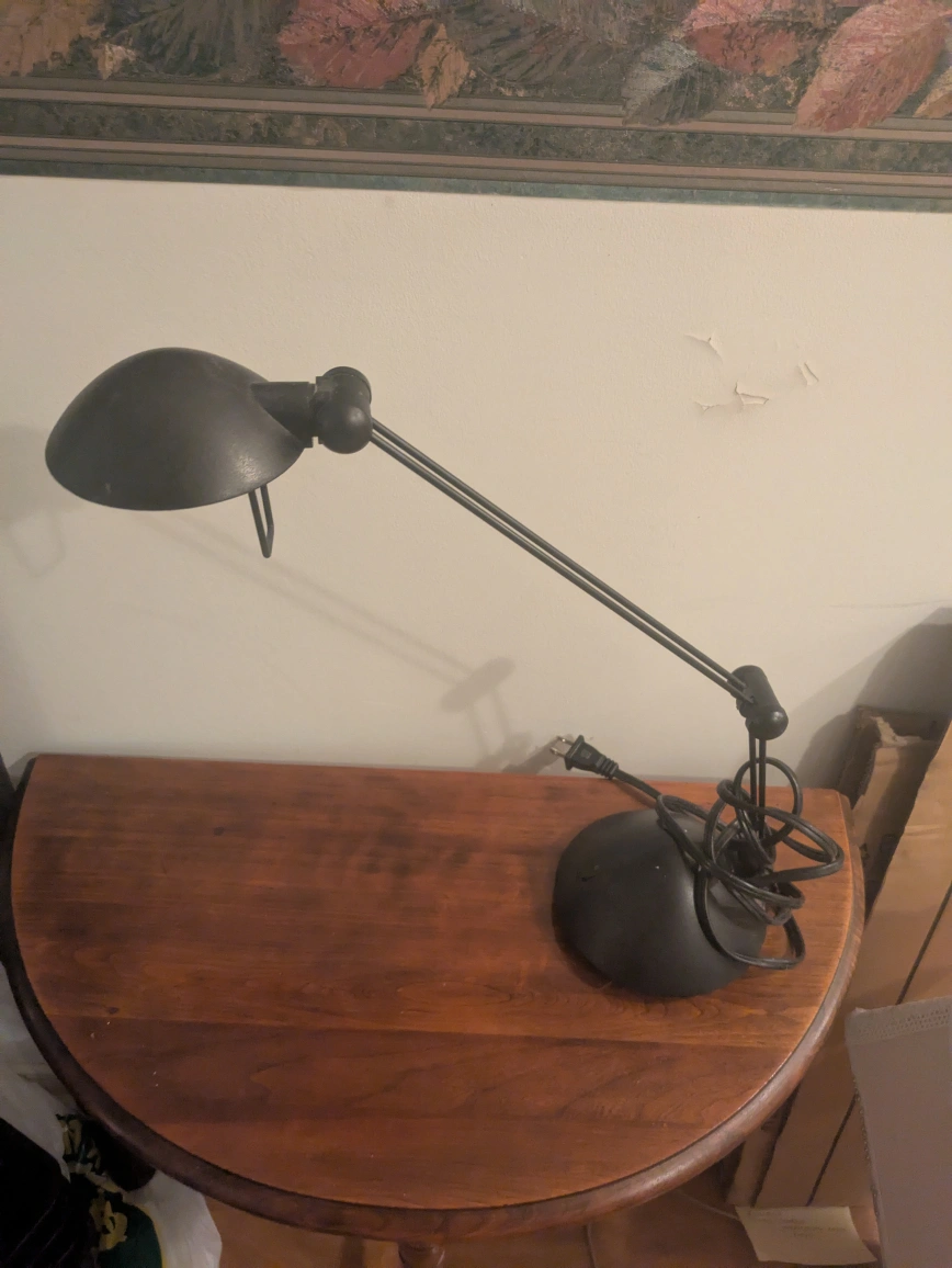 Selling a black adjustable desk lamp. It's in good condition and perfect for a home office or study space. The lamp has an adjustable arm so you can get the light right where you need it
