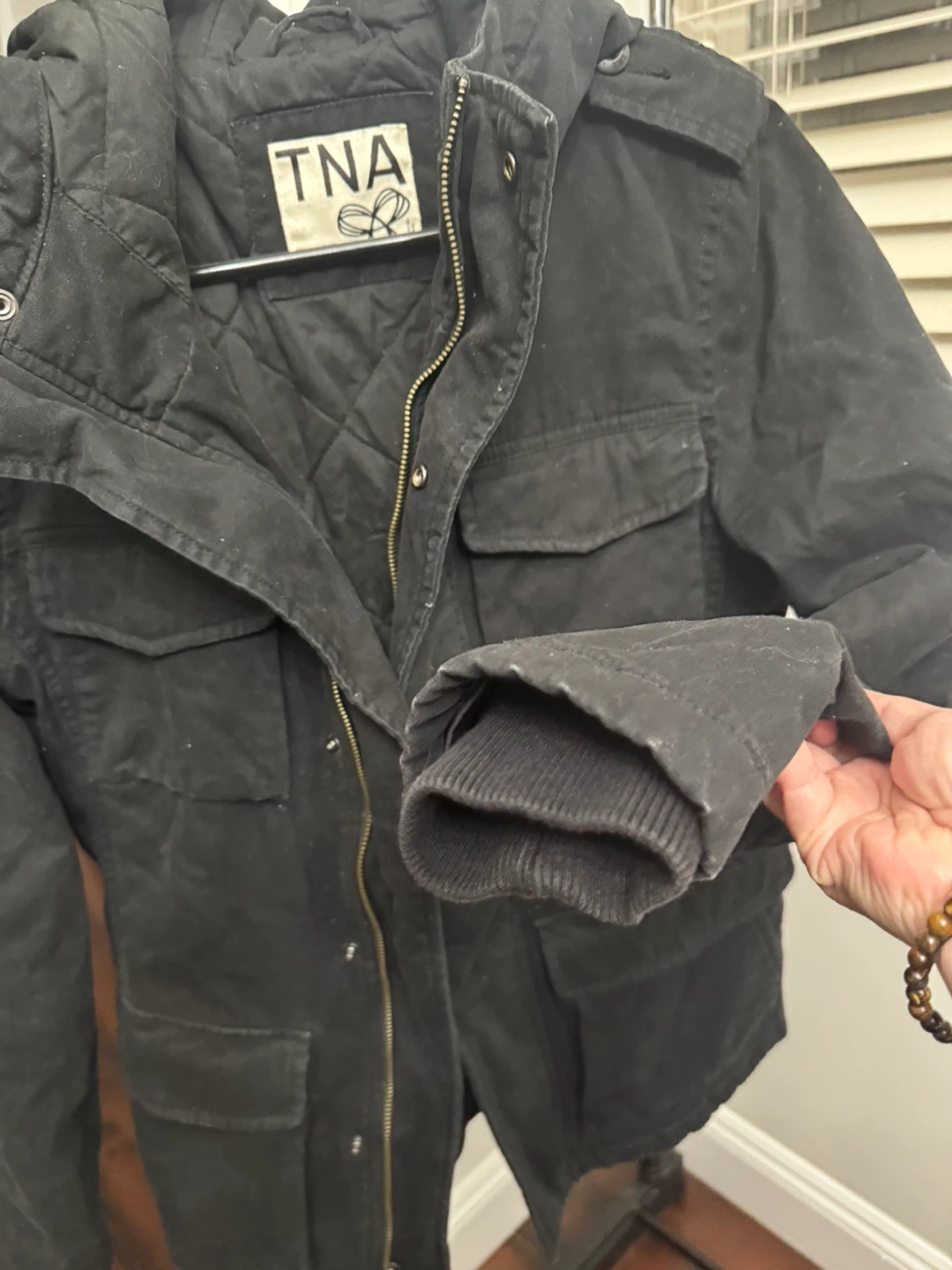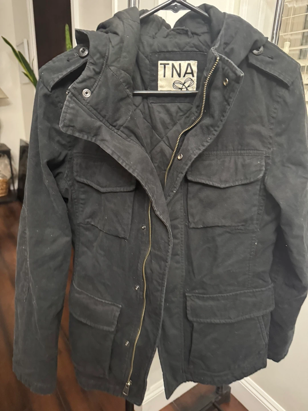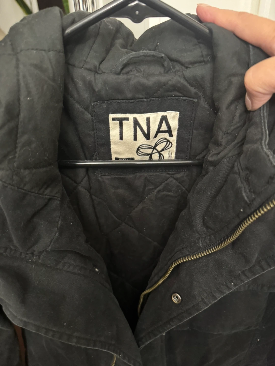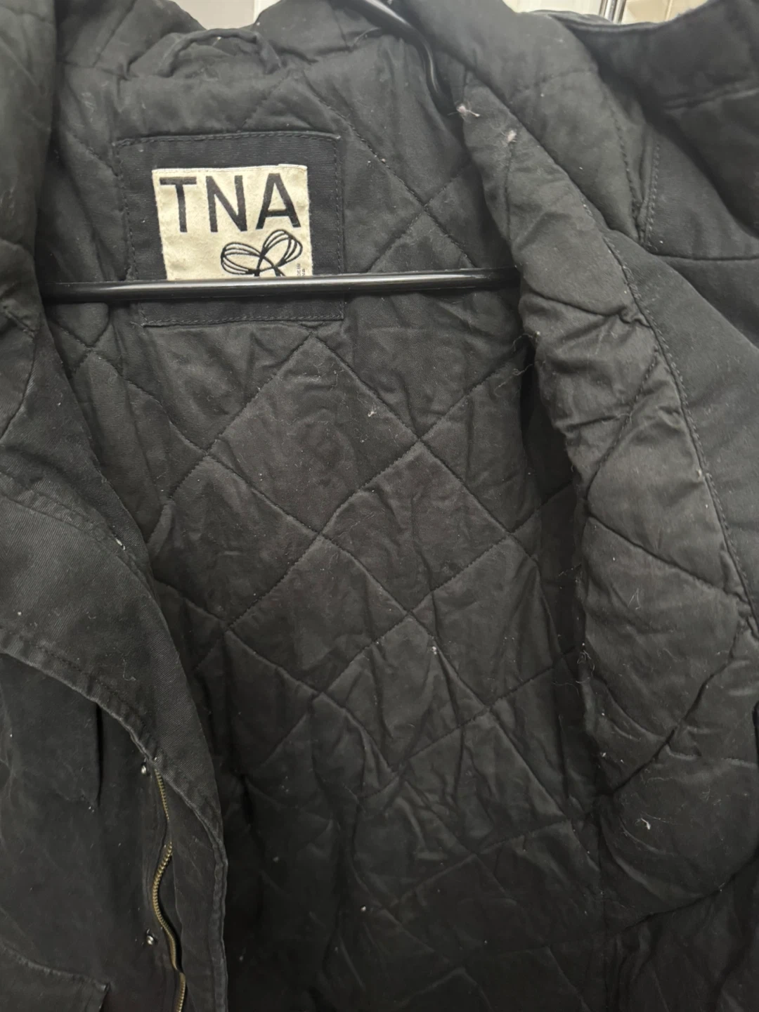 Selling a TNA black jacket in size small! It's in great condition and perfect for layering during the cooler months. The jacket features a quilted lining and multiple pockets, making it both stylish and functional
