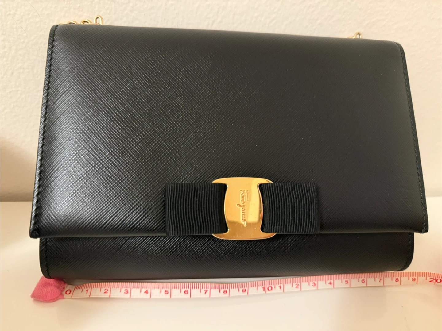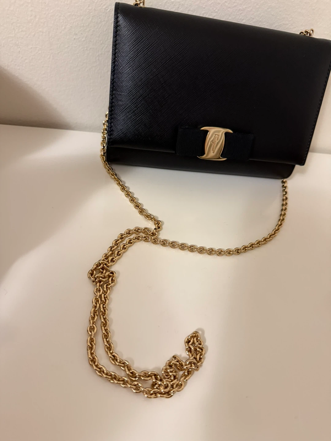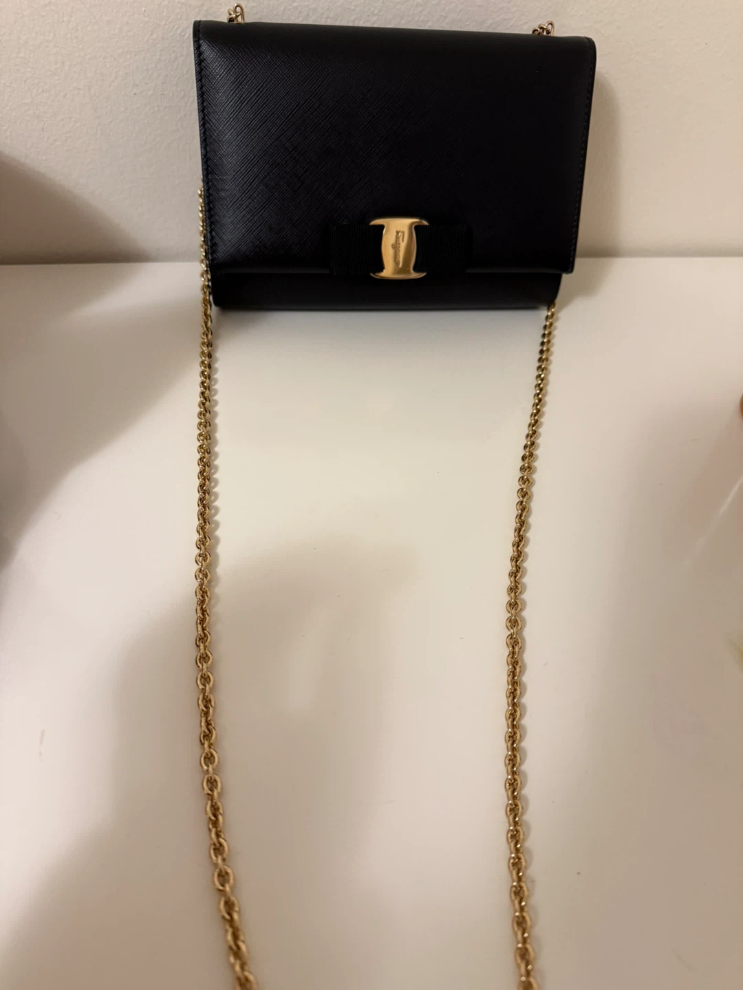 Selling a beautiful Salvatore Ferragamo crossbody bag! It's a classic black leather with a gold chain. The bag is in great condition and perfect for everyday use or a night out.