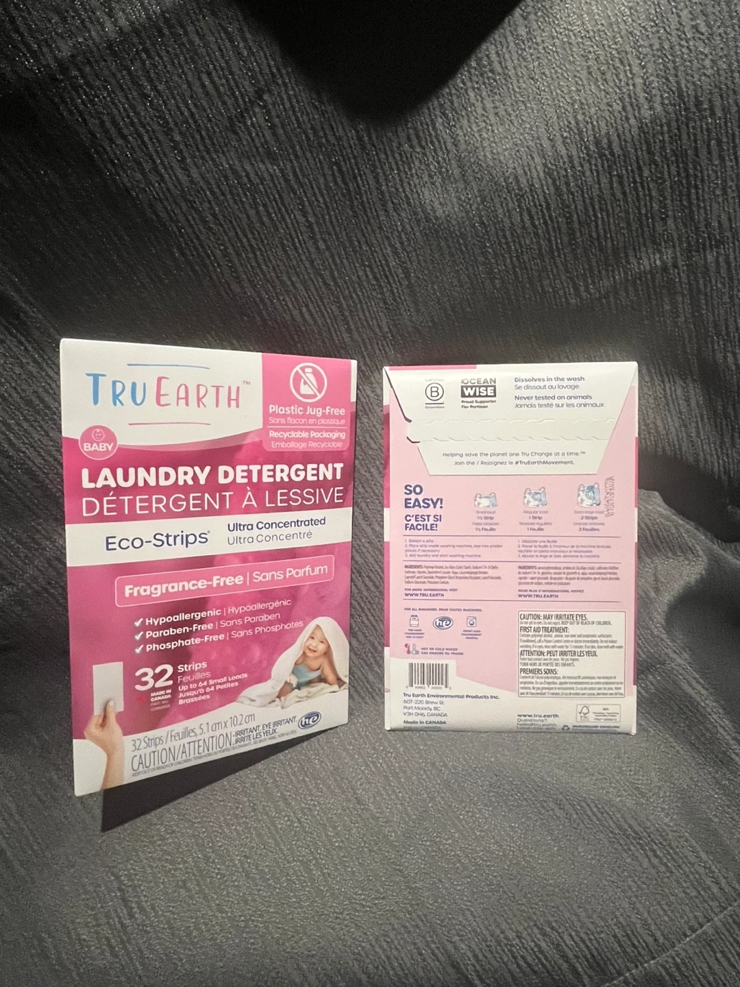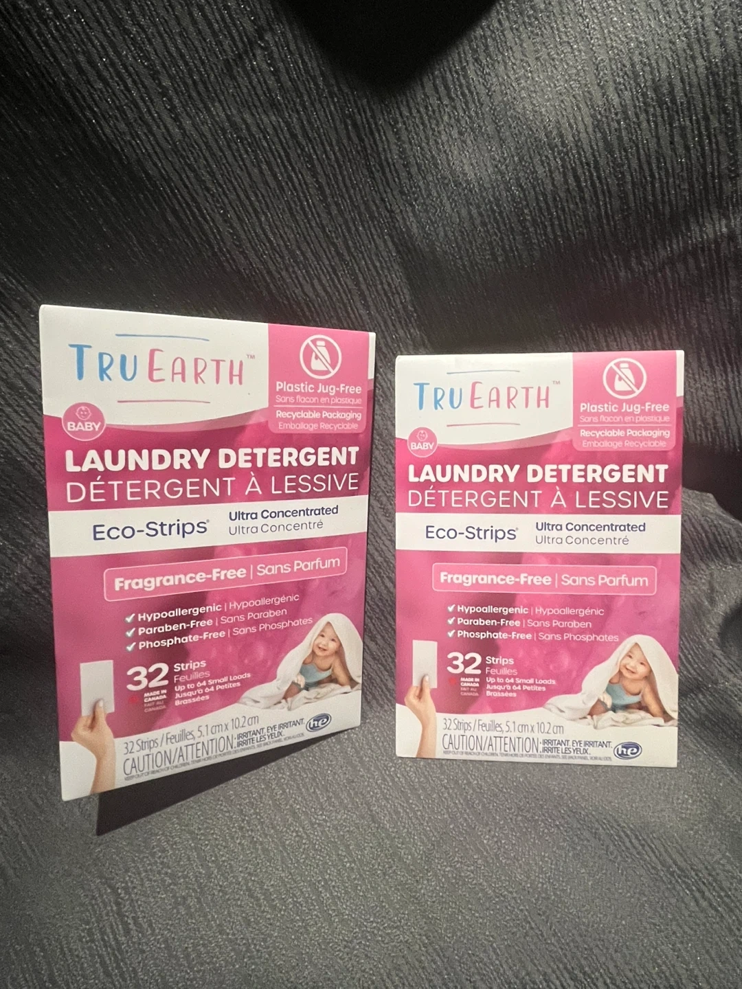 1000+I'm selling 2 Tru Earth Baby Laundry Detergent Eco-Strips! These are fragrance-free and ultra-concentrated. Each package contains 32 strips, sized at 5.1 cm x 10.2 cm. They are hypoallergenic, paraben-free, and phosphate-free, making them great for sensitive skin. Plus, the packaging is plastic jug-free and easily recyclable